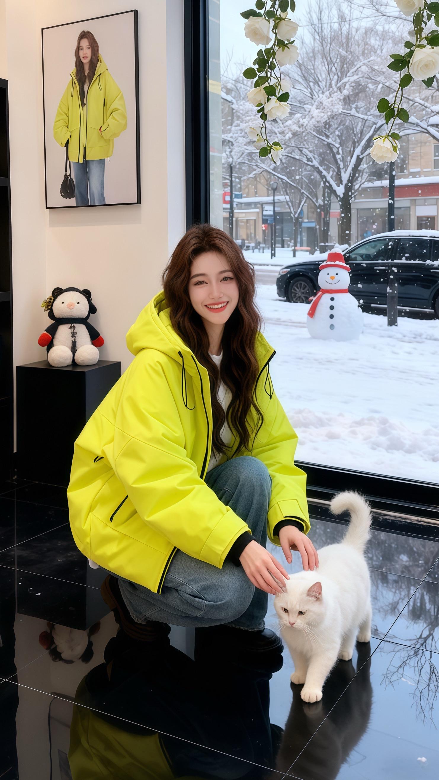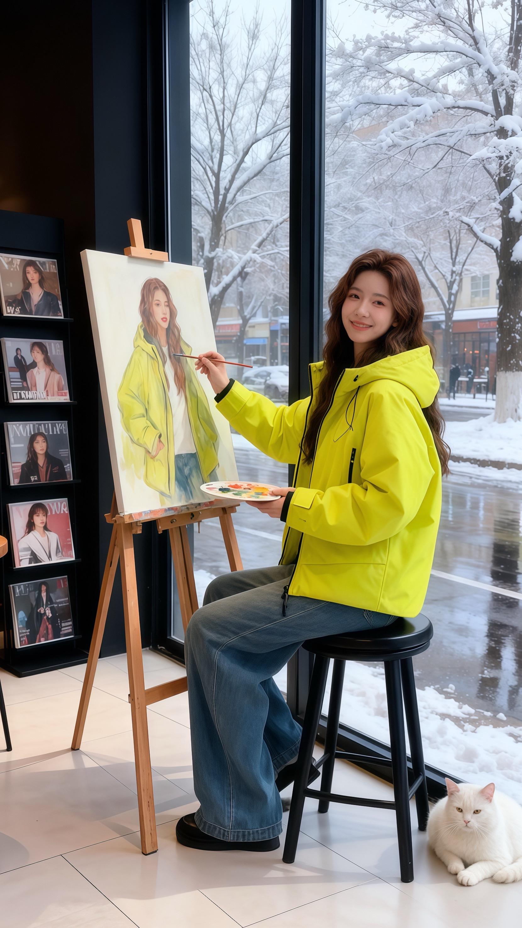 转身走进艺术咖啡馆,她坐在画架前,握着画笔在画布上复刻自己的模样——荧光黄外套搭阔腿牛仔裤,随性又吸睛。脚边的白猫慵懒地打着盹,窗外雪花簌簌,室内却因这抹黄而温暖。