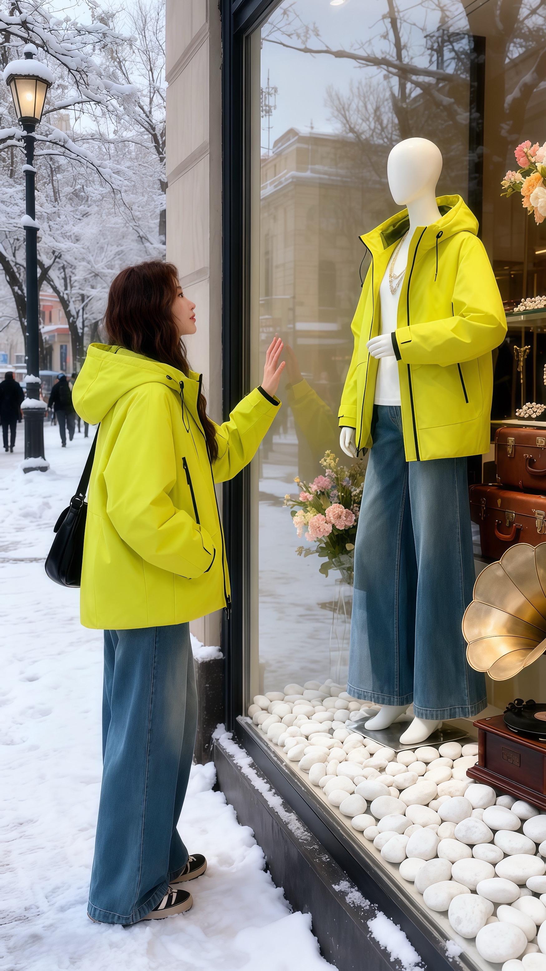 雪季霓虹:荧光黄外套里藏着整个冬天的暖。深冬的雪把城市裹成了素白画卷,林溪却像一抹跳跃的霓虹,穿着荧光黄连帽外套出现在街头。她在橱窗前驻足,看着同款穿搭的模特,那亮眼的黄色在冷调雪景里格外夺目,仿佛为沉闷冬日注入了活力剂。