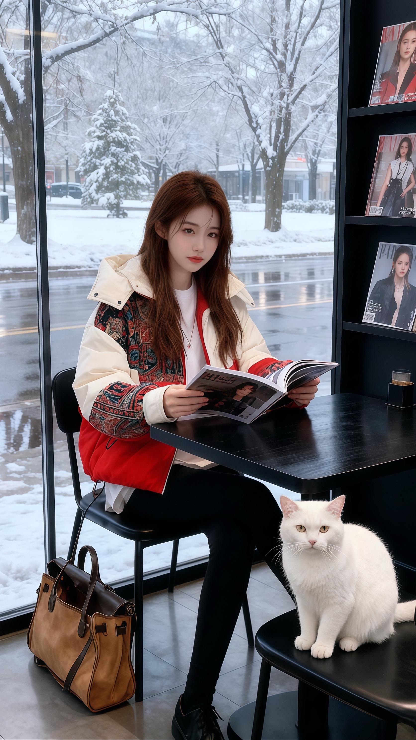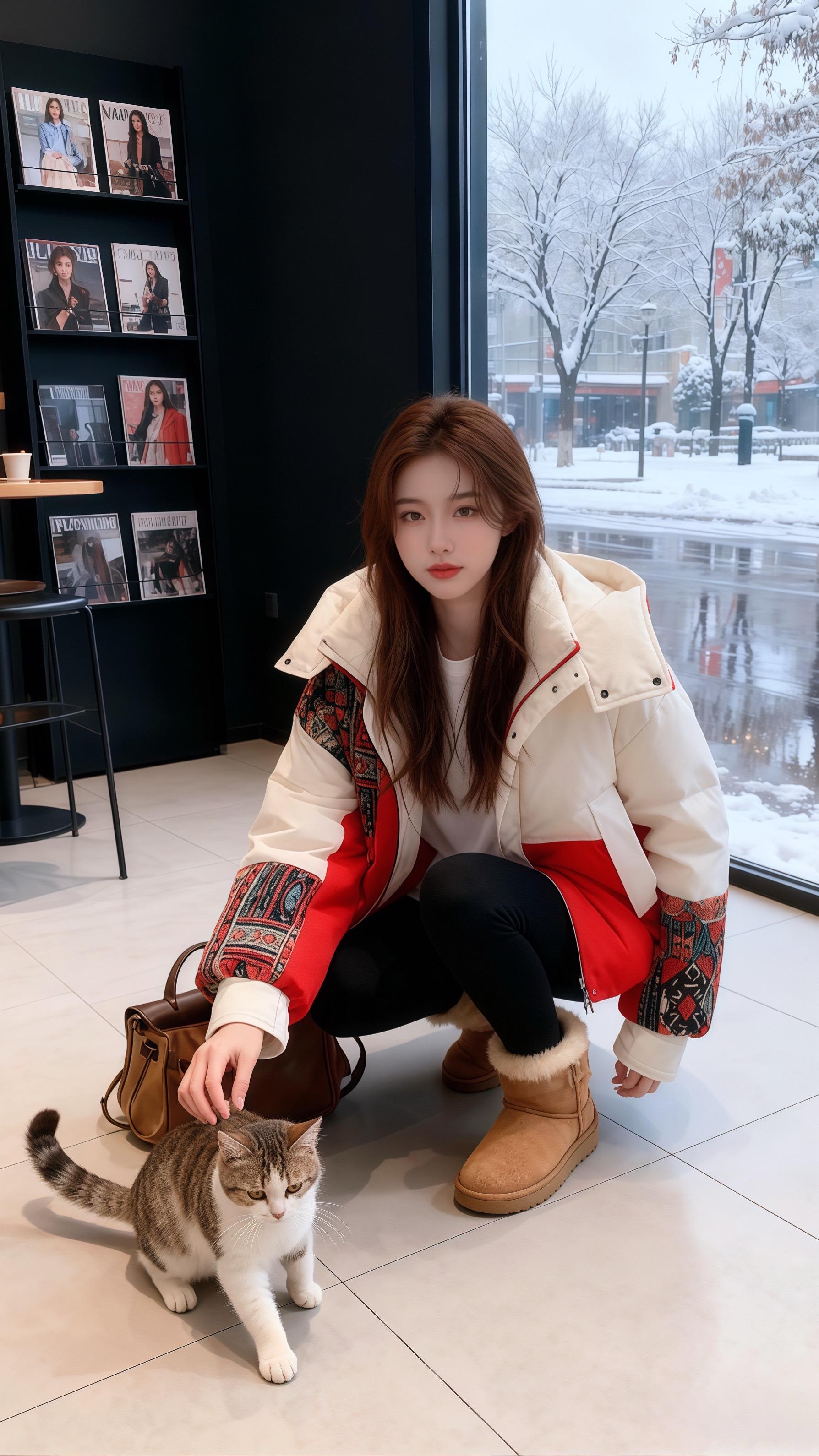 一场初雪落下时,她换了种打开方式。窝在咖啡馆里,内搭白T配黑裤,外穿羽绒服,指尖划过杂志纸页,脚边白猫慵懒蜷着。转场到店外,蹲身逗弄斑纹猫时,雪地靴的毛绒边又添了份软萌。