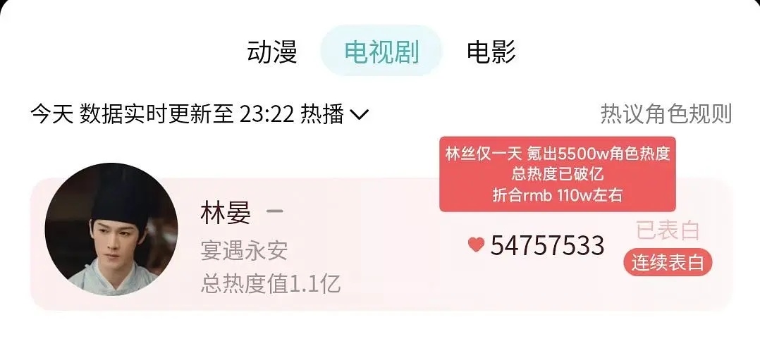 林丝300w云包场加角色热度氪金破1.1亿;