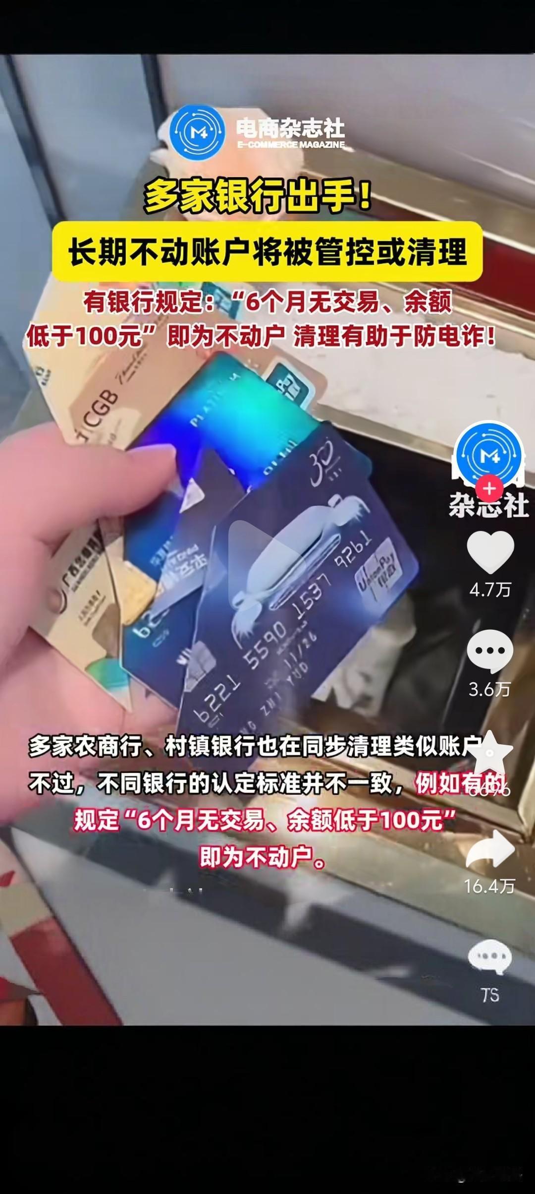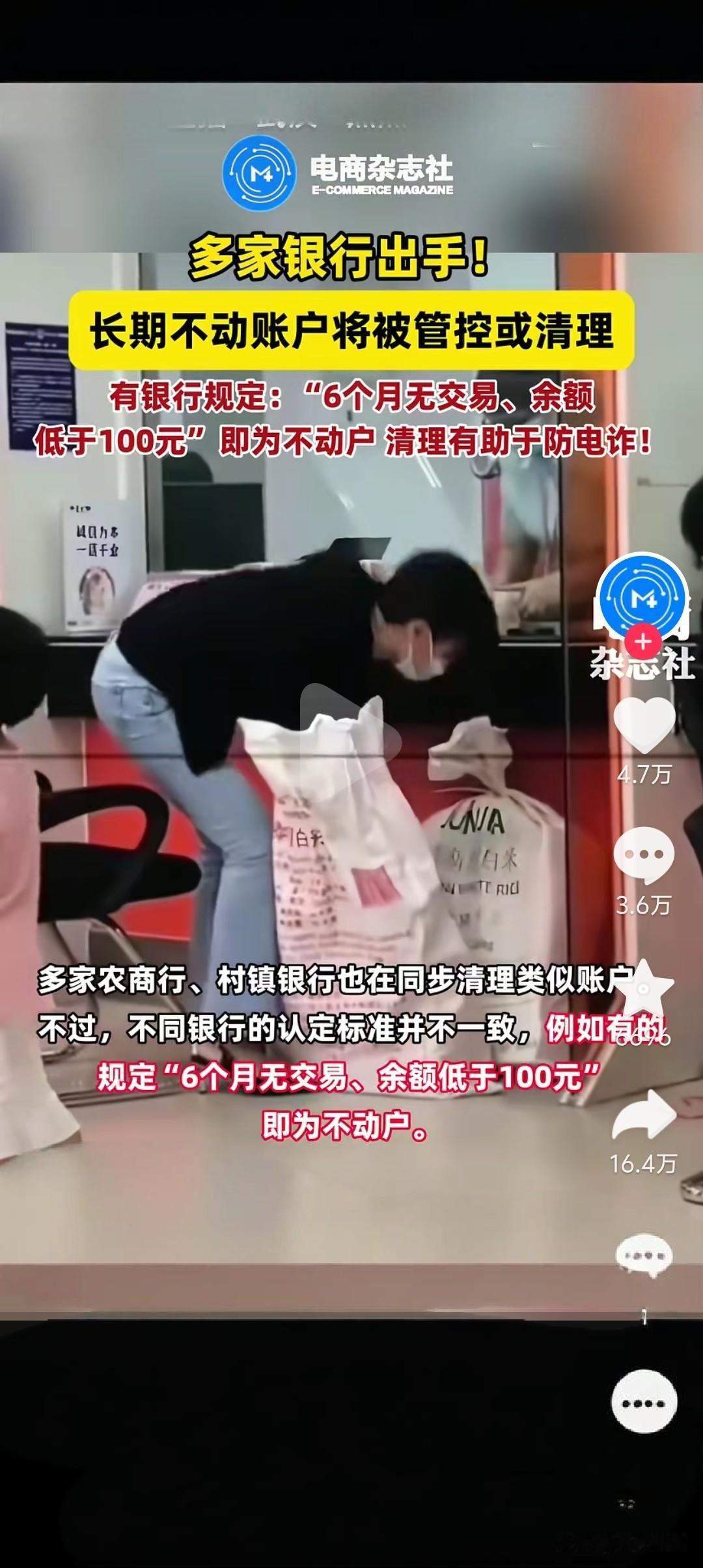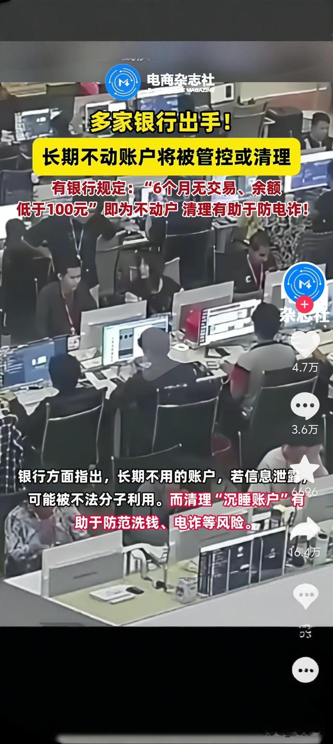 银行演都不演了,我的钱没被骗着,倒是让你明着拿了是吧。 银行推出了新消息,开始对长期没有动过的账户进行管控或者清理。 而且现在兴业银行已经宣布从10月份开始执行相关的管理措施。 什么叫做没有动过的账户呢? 连续6个月或者1年内没有交易记录,并且账户的余额低于100元(部分为10元以下),还有没有绑定贷款、理财、第三方存管等这些业务的都算。 不过也有特殊的,比如社保卡、公积金卡通常这些没有在清理的范围。 现在有很多人都在问银行为什么,明着吞钱吗? 结果银行的话真的让我无语了,什么叫做防范金融风险,还有什么是长期不用的账户容易成僵尸户,信息泄露后可能被用于洗钱、电信诈骗等这些的非法活动。 还有什么叫做清理冗余账户,便于优化银行的数据管理。 电诈没有抓到,倒是把我们银行卡里面的三瓜两枣清了? 现在都明着抢了吗?还说清理,那清理后的资金要去哪?信息又会不会被泄露给诈骗分子? 如果每一个人都有一张很久没用的银行卡,但是里面都有几块几十就是没有用过,全国加起来的数字是要被你们吞了吗?