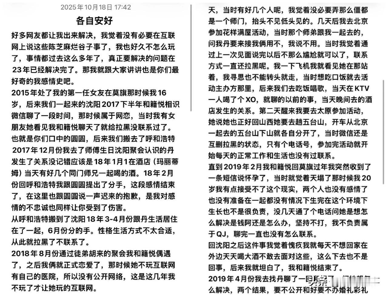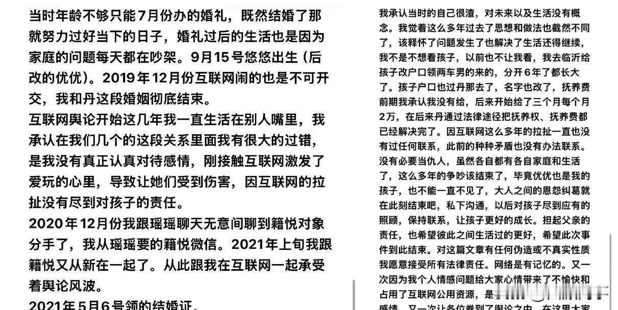 李耀阳道歉承认渣男,详细捋出与3个女人感情交叉线!出Gui、醉酒xx、网恋全内情和盘托出! 丹sir和李耀阳妻子籍悦隔空互撕,下午李耀阳发长文详细捋出感情时间线希望止戈纷争,各自安好!总结文中大意: 1、2015年与圆圆谈恋爱,2017年下半年与籍悦网恋,被圆圆发现后将籍悦拉黑断联!17年12月份去沈阳参加师父仙洋生日与丹sir相识,18年1月1号发生关系。2月份与圆圆提出分手,随后搬去沈阳3月~4月份与丹sir同居,6月份分手拉黑! 2、2018年8月偶遇籍悦正式恋爱!年底12月份再去参加仙洋生日与丹sir见面旧情复燃,KTV酒后发生关系。次日分开再没联系!(昨天丹sir说与李耀阳那次只有搂抱亲吻,没有进一步接触)。2019年2月份与籍悦回老姐收到丹sir怀孕的消息,坚持不da胎,警告不负责就告“坚强”,被迫与籍悦坦白便分手。 3、2019年4月份与丹sir重修于好,她提出要求:公开和好,办婚礼前要有求婚仪式,彩礼50万。5月20号公开复合,办了求婚仪式!因年龄小,只能7月份搬婚礼。婚后频发发生争吵,9月15号女儿出生。12月份婚姻结束! 4、2020年12月得知籍悦也分手,便与籍悦在2021年上旬重新在一起!5月6号领结婚证,2023年1月6日儿子出生,2023年7月3日沈阳办婚礼。 5、承认自己是渣男,与丹sir分开6年,女儿落户女方名下,前期确实没给抚养费,后来丹sir通过法律途径解决(每月2000元)。希望大人之间的恩怨纠葛就此结束,自己会担起父亲的责任,跟大家说对不起!