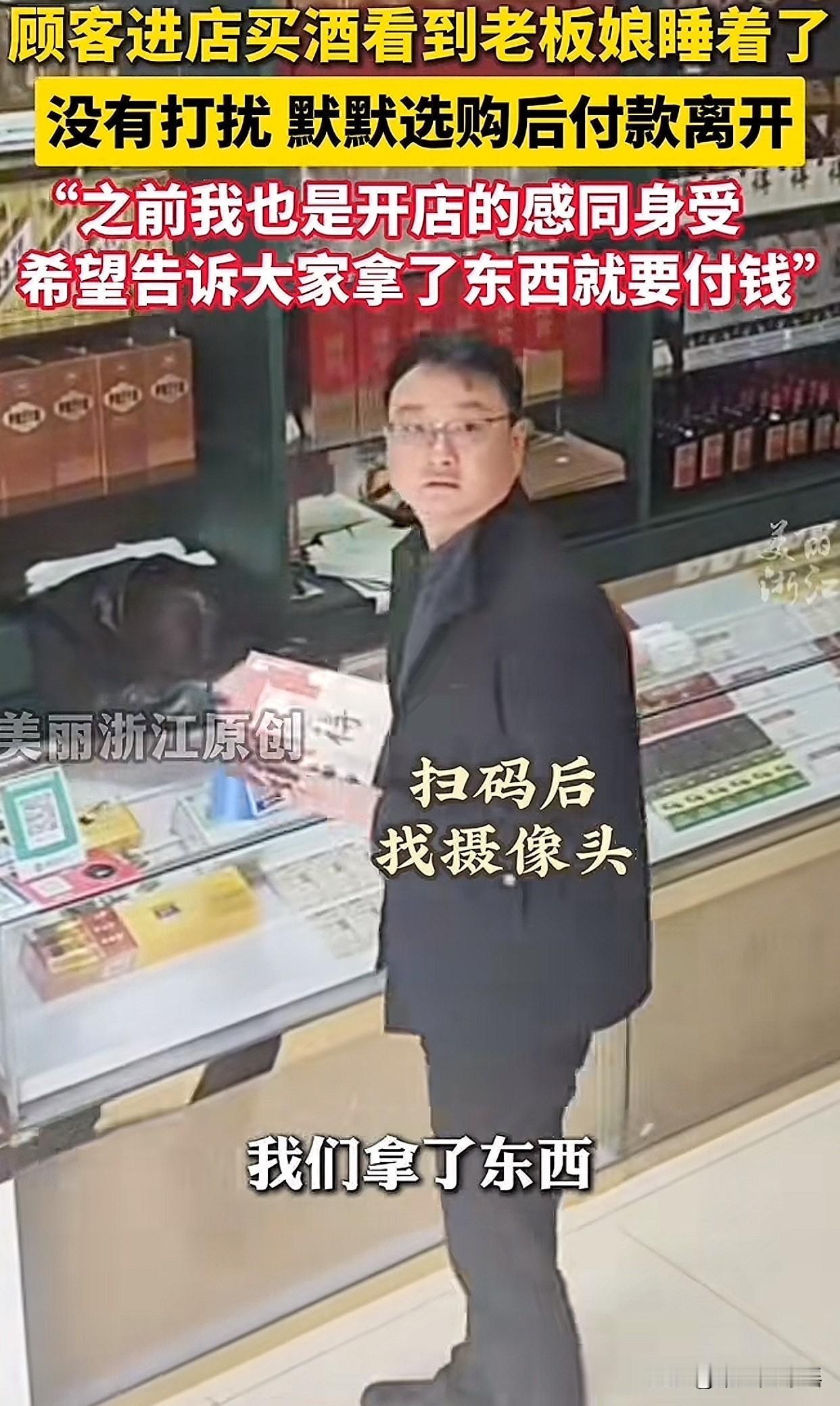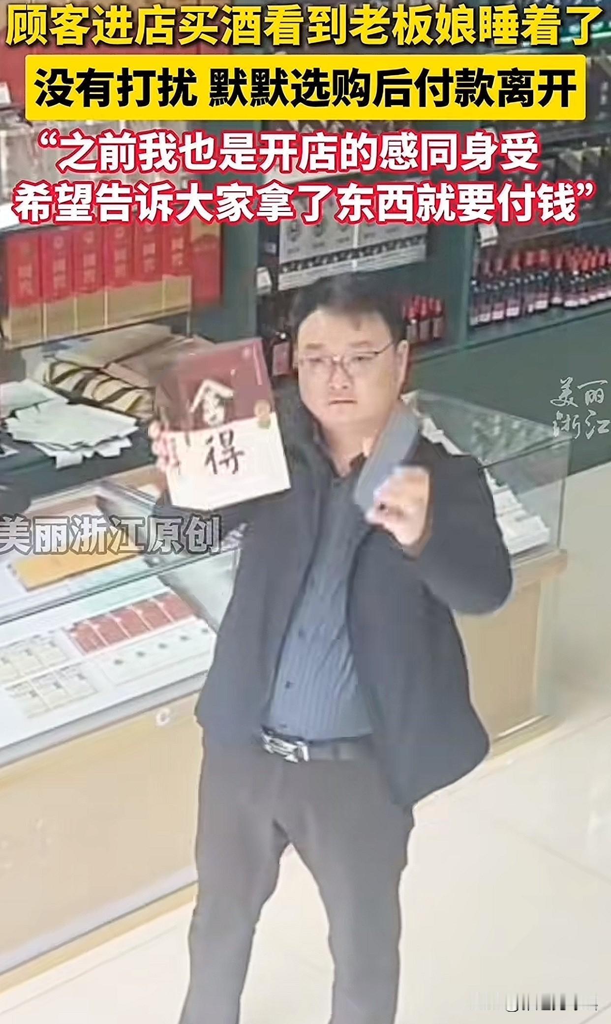 河南一家小烟酒店,老板娘大白天趴在收银台睡得正香。这时进来位男顾客,看见这场景,居然完成了一场“无声购物”,自己挑酒、扫码付钱,还特意对着监控晃了晃付款界面,全程轻手轻脚。 后来才知道,这大哥以前也开过店,特别懂守店的辛苦。说真的,他没叫醒老板娘这个举动,让我特别有感触。这哪只是有素质,这分明是“我懂你的不容易”。 现在大家越来越依赖手机,反而忽略了身边活生生的人。这位大哥的举动,恰恰把我们拉回了真实的温暖。他的善意不是装出来的,而是真正经历过才有的体贴。 说实话,现在谁不累呢?这种不打扰的温柔真的太戳心了。我觉得,真正的善良不是做给别人看的,而是在没人注意的时候,依然选择尊重别人的不易。 这个世界或许很忙,但总有人在用最安静的方式守护着善意。这种不动声色的温柔,恰恰是我们最需要的。