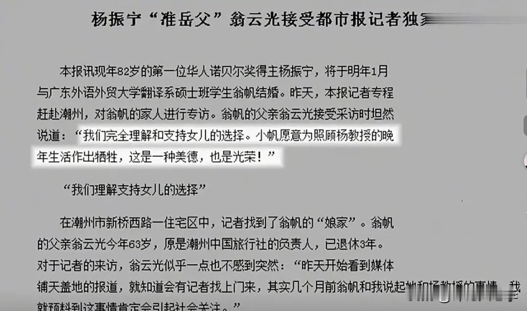 20载的陪伴与照顾,如今杨振宁去世,有很多人想知道翁帆以后还会不会再婚。对于这个问题,其实杨振宁早就表明过态度,在2015年接受杨澜采访时他就说过:翁帆可以再婚。