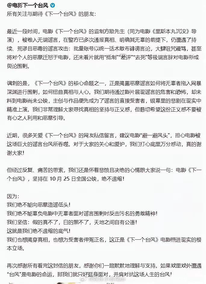 真的看了就火大!拿别人的痛心悲剧当流量跳板的人,到底长没长心啊?方励这次直接喊话那些躲在屏幕后的造谣者,我觉得骂得太解气了——你蹭的是逝者的尊严,赚的是带血的热度,还反手拖累人家要上映的《下一个台风》,这哪是“别有用心”,根本是没底线到了家! 别以为躲在暗处敲键盘就没事,网暴方励个人就算了,连人家用心做的新电影都不放过,这哪是蹭流量,明明是毁别人的心血。方励说“有证据就实名举报”,这话够硬气,毕竟网络从来不是法外之地,你今天敢拿悲剧当噱头,明天就该为自己的恶行担责,总不能让坏人为所欲为吧? 你们平时刷到过这种拿坏事蹭热度的情况吗?要是换成你遇到这种事,会像方励这样直接硬刚,还是有其他办法?评论区聊聊你的想法!
