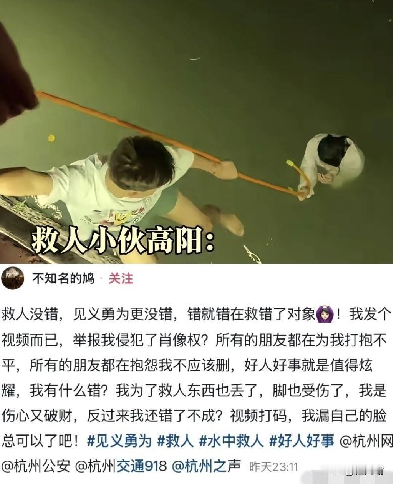 浙江,男子救下落水女子,因为是第一次做好人好事,男子内心很自豪,就把视频发到了网上,没想到女子看到后,竟说男子侵犯了肖像权,然后把视频举报下架了。 当晚男子路过河边,突然听见声响,看见有人在水里浮浮沉沉,双手乱挥。他来不及多想,直接翻过栏杆跳了下去,他很快抓住了女子,在岸上朋友的帮助下,用绳子把她拖上了岸。 女子被救上来后,直接送去了医院,连句谢谢都没说。男子自己脚被划了好几道口子,去医院清理伤口、打破伤风针,回头才发现手机、钱包也丢了。 这是男子第一次救人,心里很有成就感,他从路过网友那拿到救人视频,发在了社交账号上。 结果没过多久,女子突然联系他,让他删视频,说涉及隐私,男子还没反应过来,就收到了举报通知。 男子说视频里根本看不清她正脸,然后将视频打码重新发了,配文“救人没错,错就错在救错了对象”。 网友觉得女子太冷漠,连句谢谢没有,反手就举报,这不就是现实版“农夫与蛇”? 男子发视频本来是希望得到认可,结果没等来感谢,先收到了投诉,换谁心里都会不舒服。不想自己落水狼狈的样子被发上网可以理解,但可以先道谢再好好说,没必要用投诉的方式。 被救者应该心存感恩,这样善意才能持续传递,社会才会更温暖。