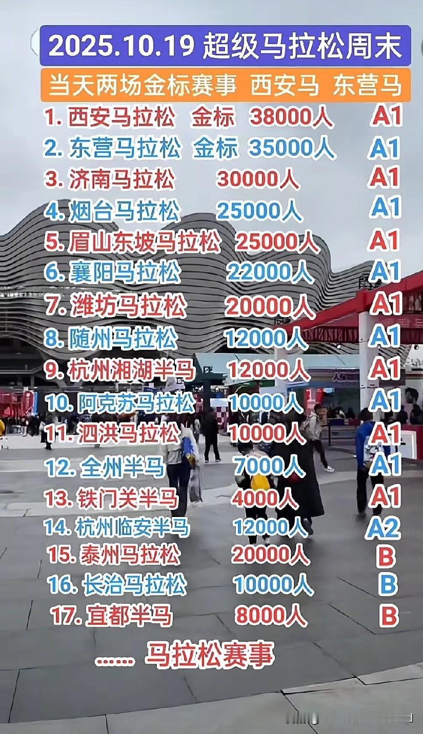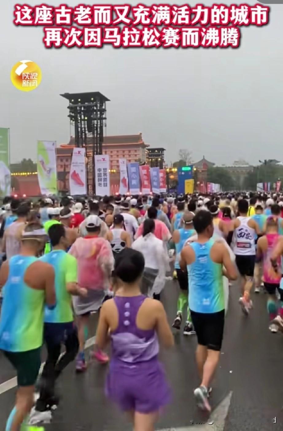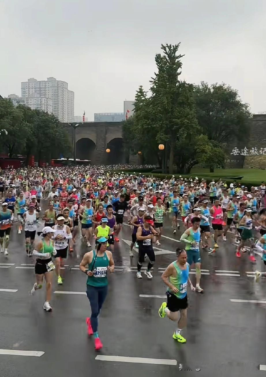 西安马拉松早七点半开跑, 蒙蒙细雨中, 38000人的参赛者, 在自发大合唱的国歌声中跃跃欲试。 一声令下,万箭齐发,冲进永宁门, 开启西马的征程。 10月19号, 同一天的马拉松, 举办城市知多少?