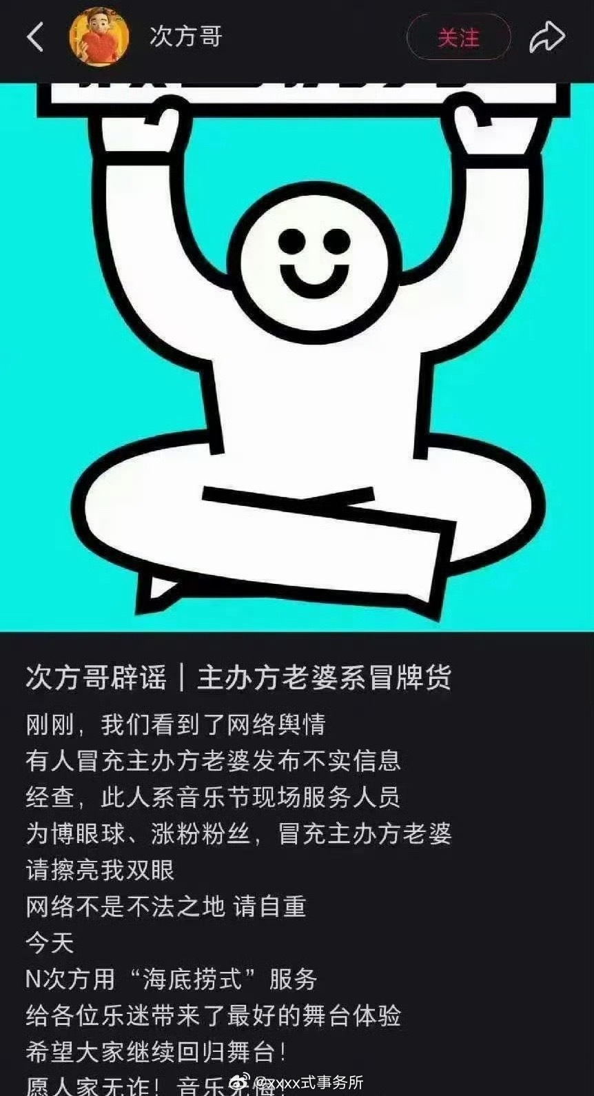 主办方辟谣发布不实信息的不是主办方老婆,是现场工作人员[笑cry]音乐节主办方辟谣 ​​​