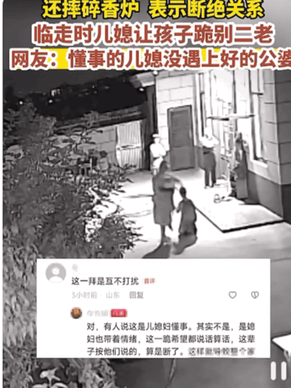 这一跪,亲情成永别!江苏泰州的这个夜晚,仿佛一场家庭悲剧的终章,让无数网友心碎不已。一个原本温馨的家庭,竟在一瞬间崩塌得如此彻底。女子带着两个年幼的孩子,被赶出家门,曾经的温暖与包容仿佛都被一场突如其来的争执撕得粉碎。更令人心碎的是,婆婆当面摔碎香炉,以断绝一切亲情的象征,仿佛在宣告这个家庭的终结。 但这背后,隐藏着多少家庭的无奈与无助?我们或许只看到表面上的争吵,却难以理解那一份深藏心底的痛。亲情,原本是温暖的港湾,是无条件的守护,可为何在某些时刻,却变得如此脆弱?这不仅仅是一次家庭的裂痕,更是社会的缩影。现代快节奏的生活,让人与人之间的距离越拉越远,家庭关系也在无形中变得复杂而微妙。 女子在绝望中选择了叫来两个儿子,跪拜给爷爷奶奶,试图用一份孝心挽回那即将破碎的家庭。她的动作,或许在别人眼中只是一个无奈的哀求,但在我看来,却是一份极其珍贵的坚守。面对家庭的裂痕,她没有选择放弃,而是用行动表达了对亲情的渴望和珍惜。这一跪,或许无法弥补所有裂痕,但它告诉我们:即使在最黑暗的时刻,亲情依然值得我们用尽全力去守护。 而当她转身离开,带着心碎的背影,仿佛在诉说:有些伤痛,只有自己才能疗愈。家庭的裂痕,也许无法一夜修复,但每一次的真心付出,都是未来修补的希望。我们每个人,都可能在某个瞬间,面临家庭的考验。也许你我都曾被误解、被伤害,但只要心中那份对亲情的执着没有熄灭,就一定有希望迎来新的光明。 这起事件引发了广泛的讨论:家庭的界限在哪里?孝顺的底线又是什么?在这个充满变数的时代,亲情到底该如何守护?或许,我们都应该从中反思:真正的亲情,是包容与理解,是在争执中依然坚持的那份爱。愿每一个家庭都能在风雨中坚守那份温暖,不让“这一跪”成为永别的终点,而是重新连接的开始。