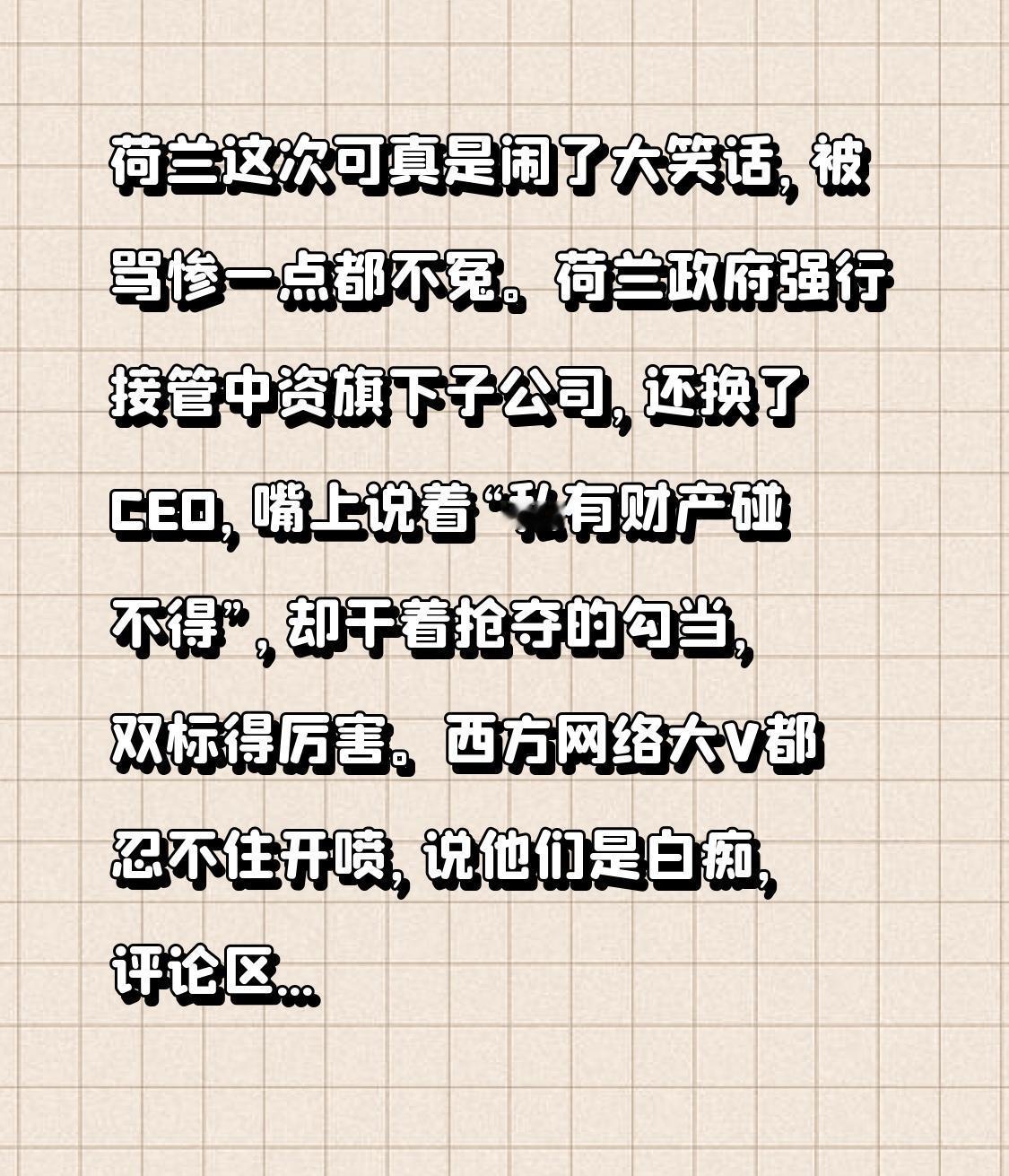 荷兰这次可真是闹了大笑话,被骂惨一点都不冤。荷兰政府强行接管中资旗下子公司,还换了CEO,嘴上说着“私有财产碰不得”,却干着抢夺的勾当,双标得厉害。 西方网络大V都忍不住开喷,说他们是白痴,评论区100多条留言也是一边倒地批评。中国迅速反制,实施出口禁令,荷兰立马慌了,经济事务大臣忙着找中国谈解决方案。 这背后明显有美国撺掇,荷兰却硬说自己做决定。这件事打了西方“讲规矩”的脸,也让大家明白,现在谁想随便欺负人,不讲理就得挨反击。