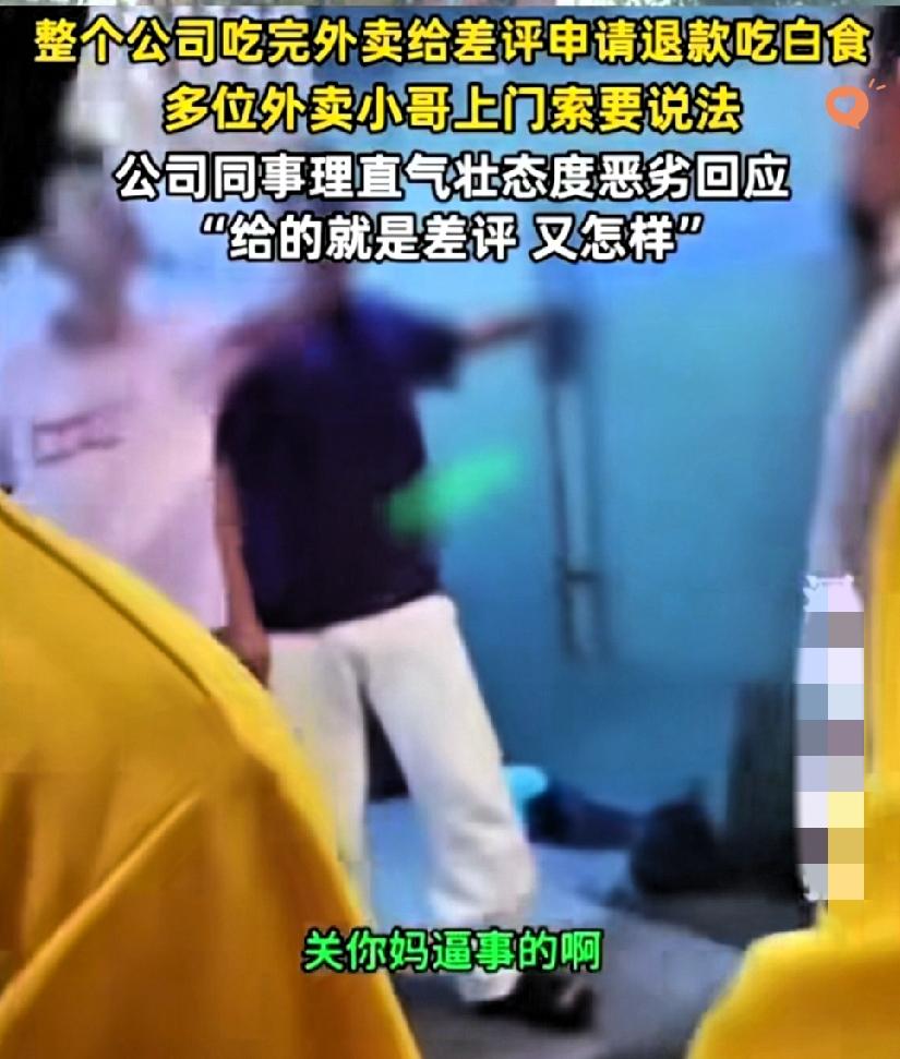 这家公司是想靠“吃白食”火出圈吗? 深圳这波操作,真是把自私无下限演绎得淋漓尽致。 整个公司组团吃外卖,吃完就申请退款说没收到,转头还反手给外卖小哥差评。 骑手们实在忍不了集体上门要说法,这帮人居然还理直气壮喊“给的就是差评,又怎么样?” 他们不知道,差评对骑手来说就是“收入杀手”,不仅拿不到奖励,派单量都得受影响,辛辛苦苦跑单的钱可能就这么没了。 更别说这种恶意差评,早违反了平台规则,严重的甚至能算敲诈勒索。 一个公司能集体干出这种事,根本不是个人素质问题,而是整个团队的价值观都歪了。 连基本的诚信都不讲,还能指望他们好好做事? 你们说,遇上这种恶意差评和白嫖的,平台该怎么罚才解气?