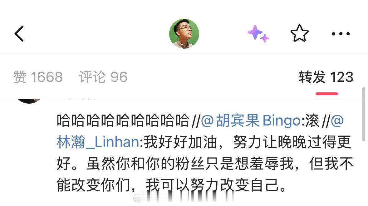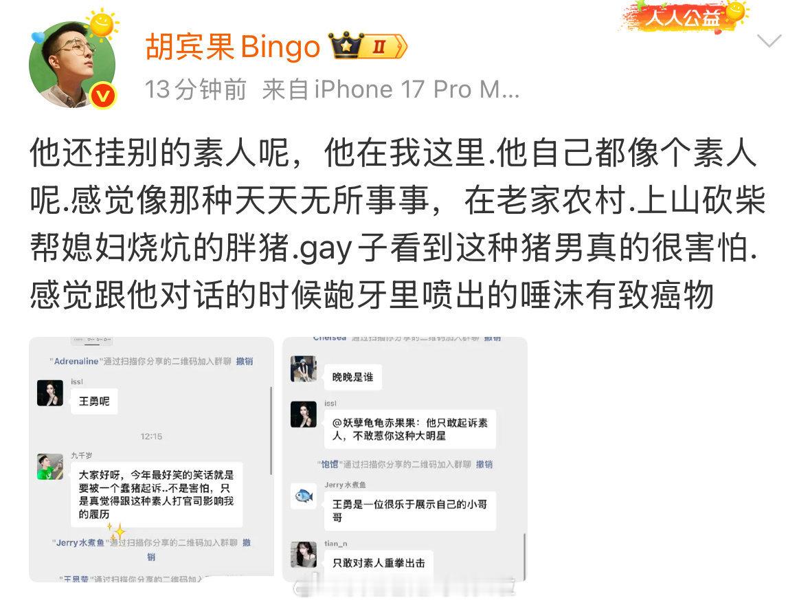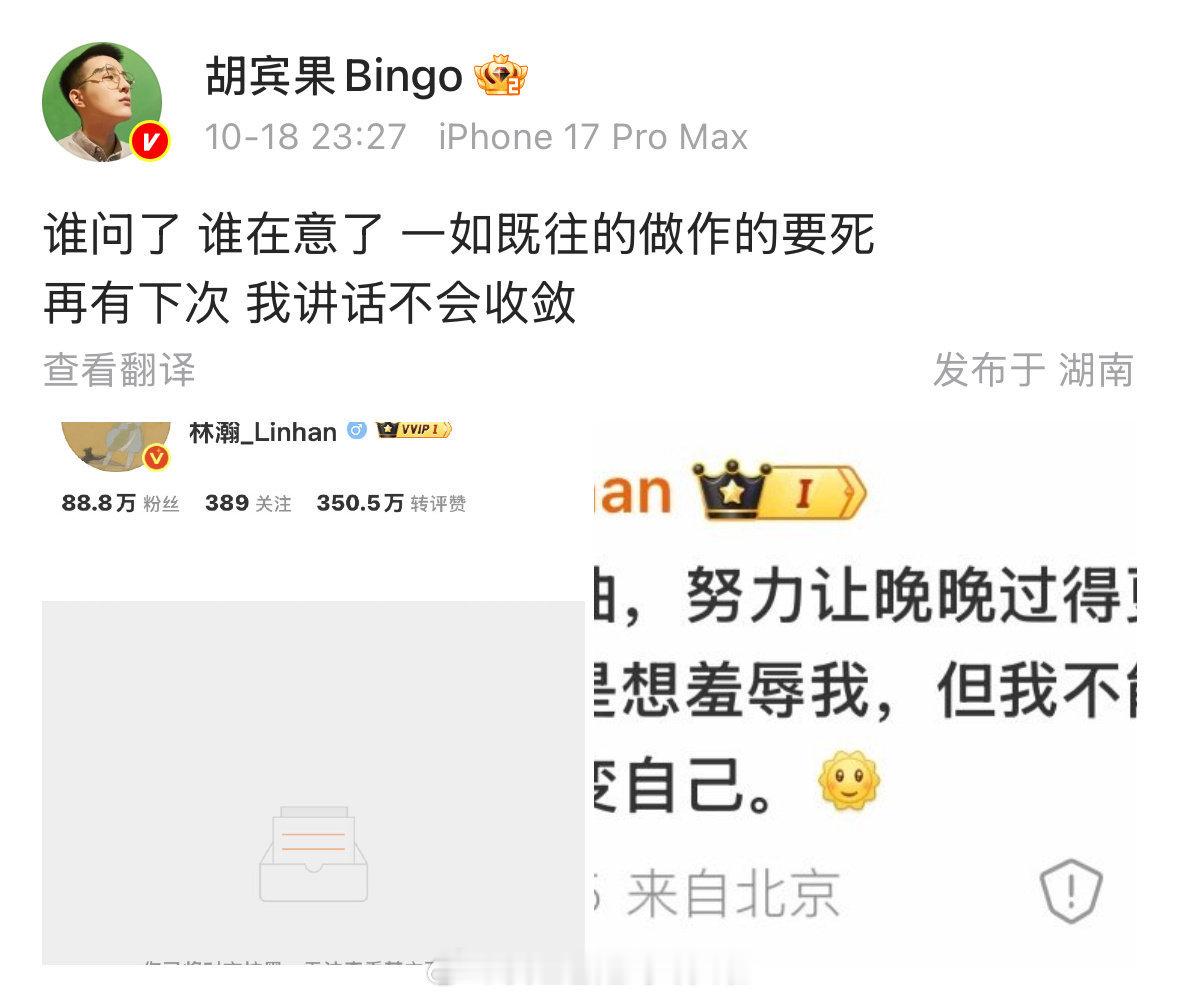 晚晚老公林瀚挂了素人的正脸照(未打码),不过战斗力更强的胡宾果现在在和他大战,他对胡宾果目前还挺礼貌的