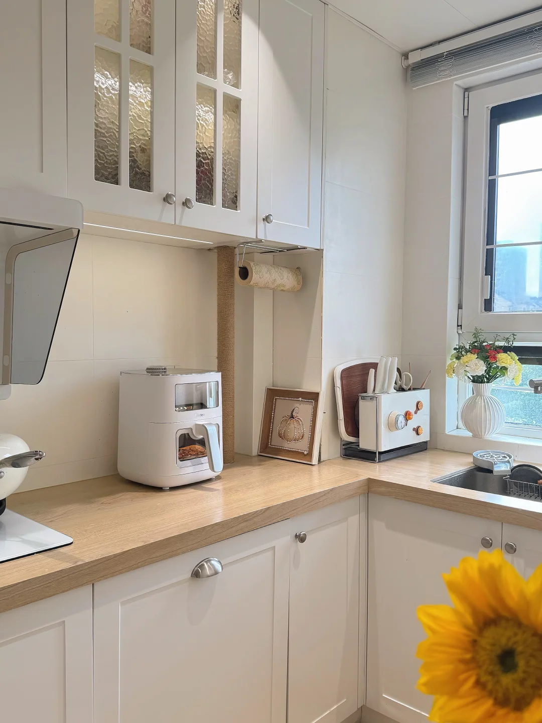 暖白橱柜+木纹台面,营造温馨又治愈的氛围,开放式布局让空间更通透,小厨房也不显拥挤