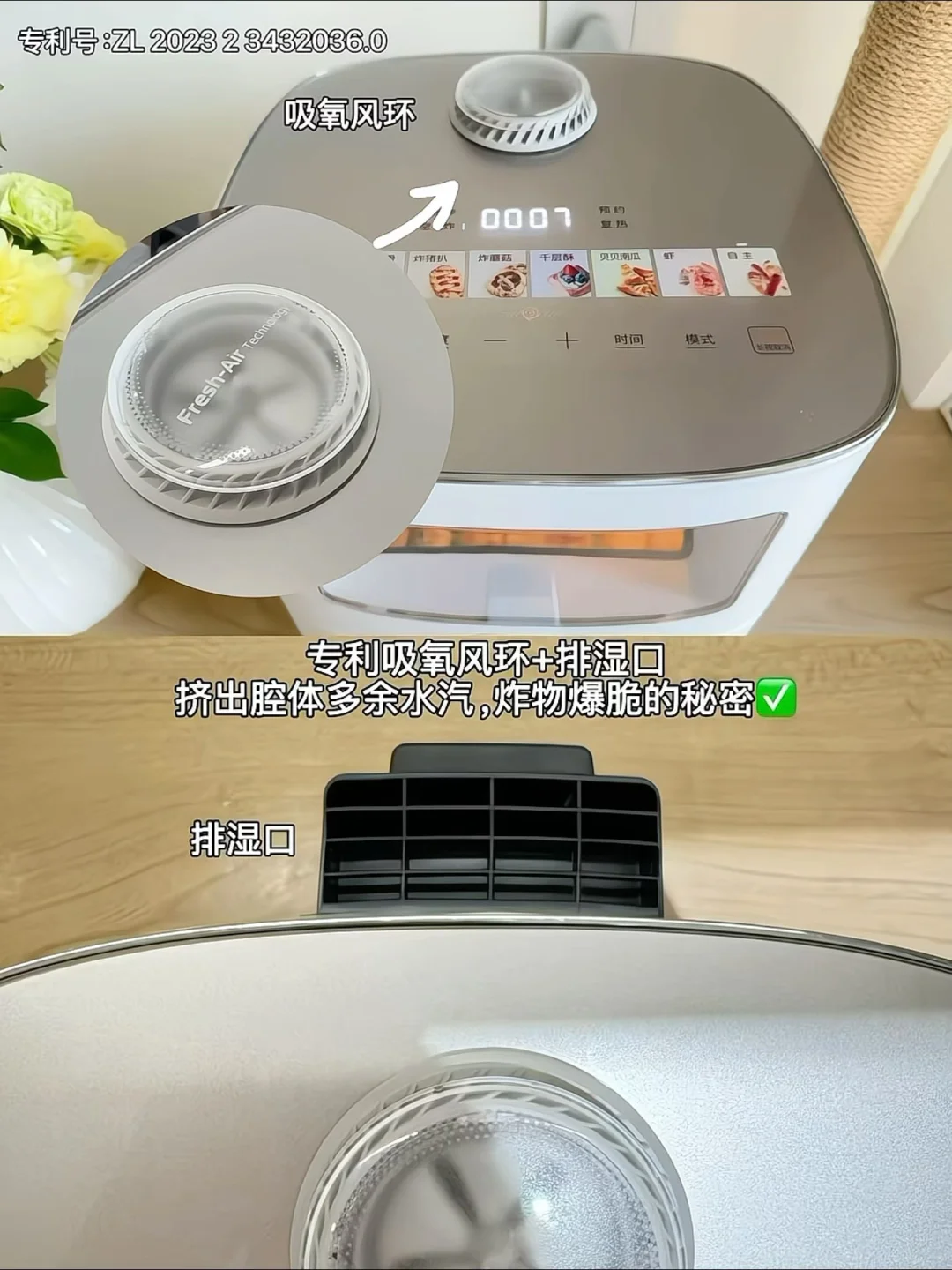 顶部的吸氧风环是食物酥脆的开关,配合背后的排湿口🔄,能快速吸入氧气的同时挤出烹饪时产生的水汽💧,达到活氧排湿的效果,搭配上下双热源均匀烘烤♨️,逼出食物多余油脂健康又好吃,仿油炸的工艺还能直接通过三段温变曲线还原油炸的加热过程,不用开火不用起油,就能吃到完美复刻油炸的口感😋