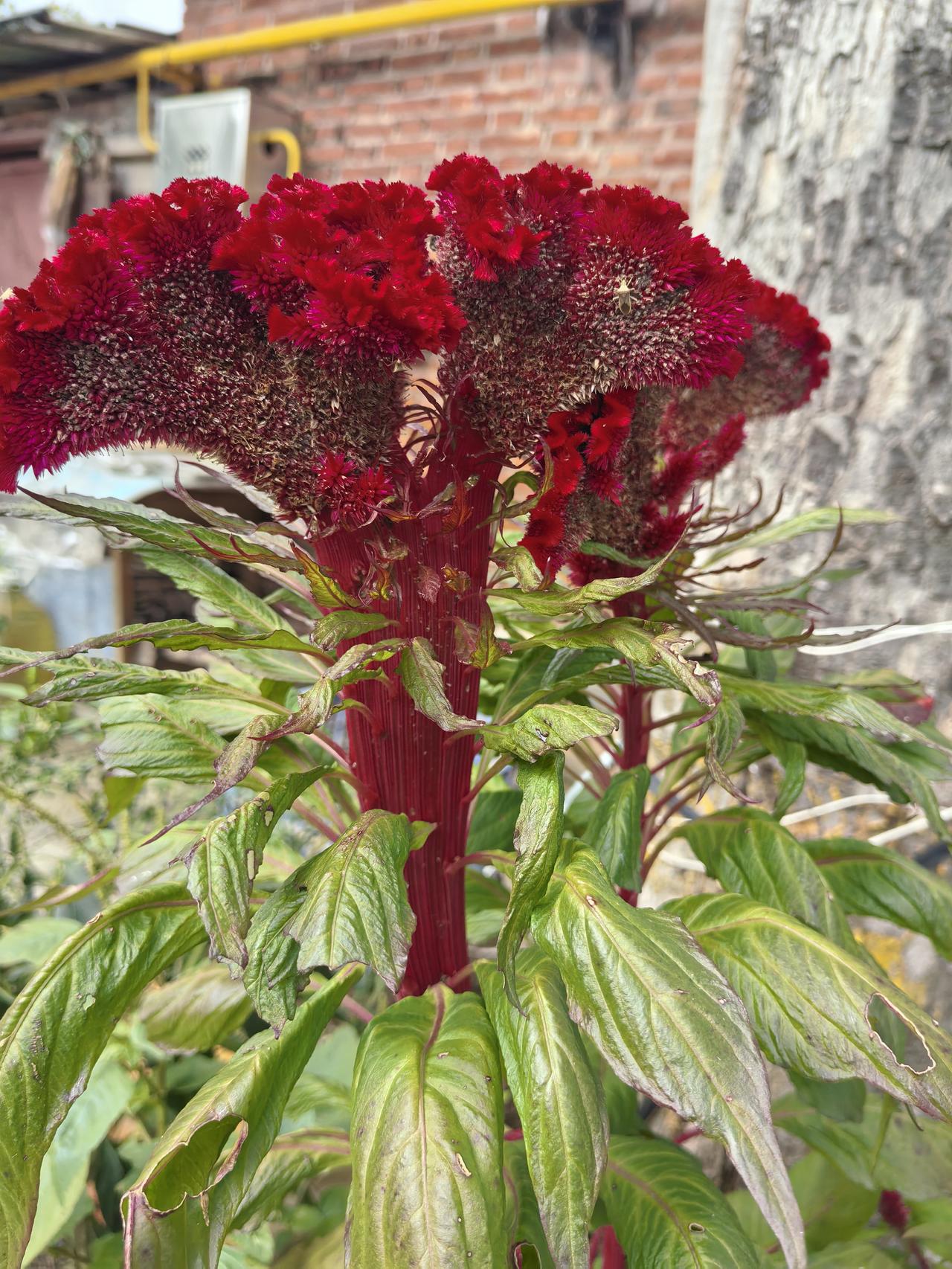 我家小院的“红绒花团”,开得比隔壁李婶的广场舞还热闹 那天我正蹲在小院里扒拉杂草,一抬头,好家伙!那丛鸡冠花跟打了鸡血似的,红得跟过年的灯笼似的,花团绒绒的,风一吹,颤巍巍的,比隔壁李婶跳广场舞的队伍还热闹。 你瞅那花茎,红得发紫,直挺挺地戳在那儿,叶子绿得油亮,就是边缘有点小破洞,估计是被哪只贪吃的小虫给啃了。这花也怪有意思的,开起来没个章法,一团一团的,跟把红绒线团往那儿一扔似的。 每次路过的邻居都得停下脚,“哟,你家这花,真喜庆!”我就乐呵,这花啊,不挑地儿,给点阳光就灿烂,跟咱普通人过日子似的,热热闹闹,滋滋润润,多好!