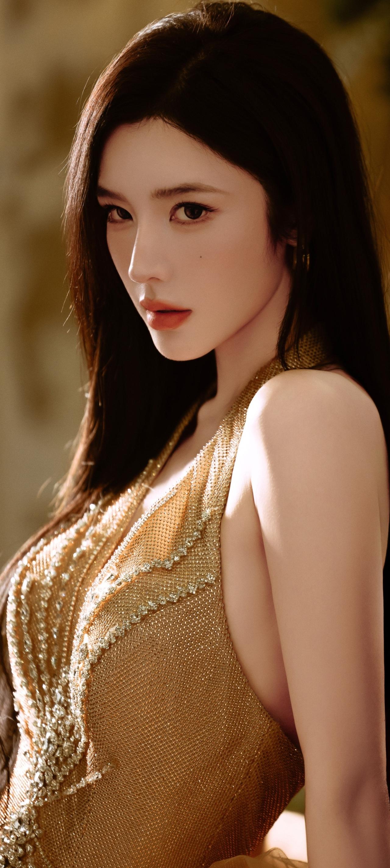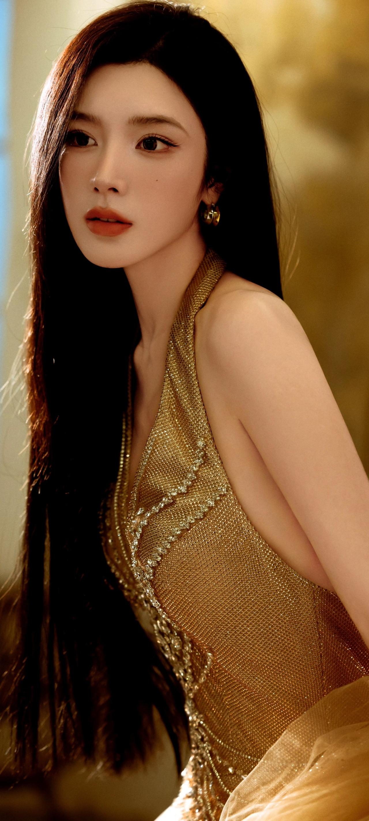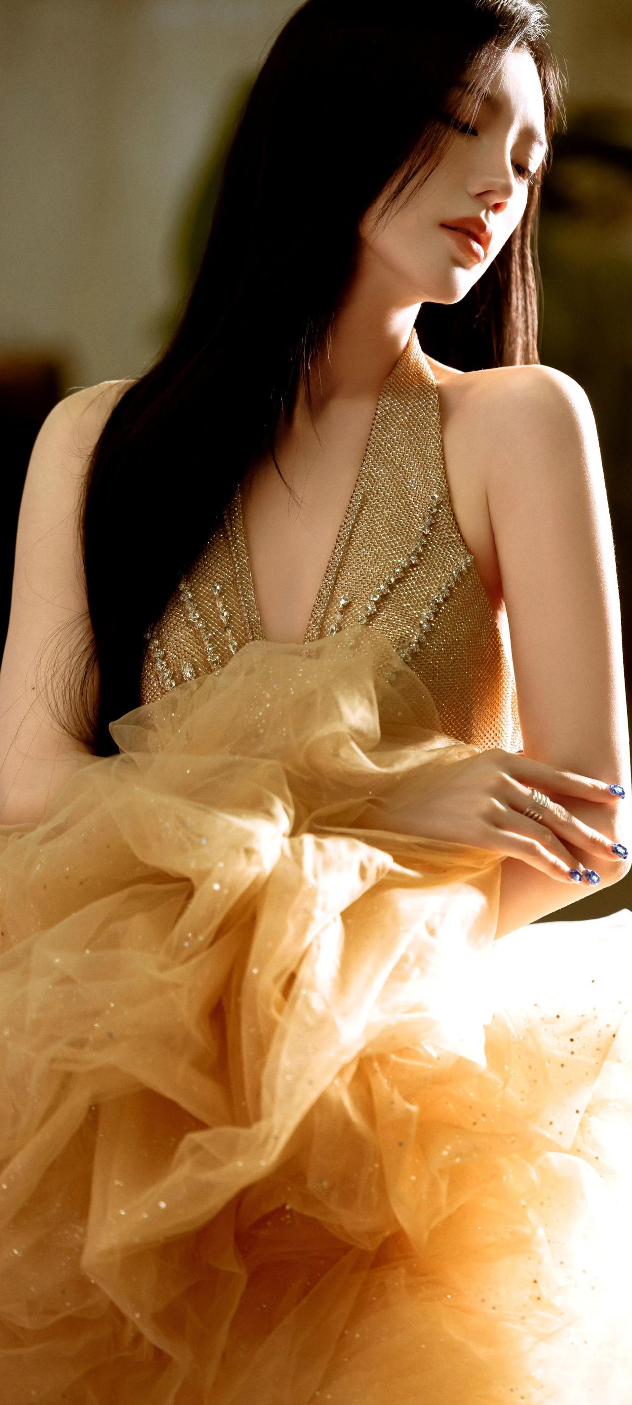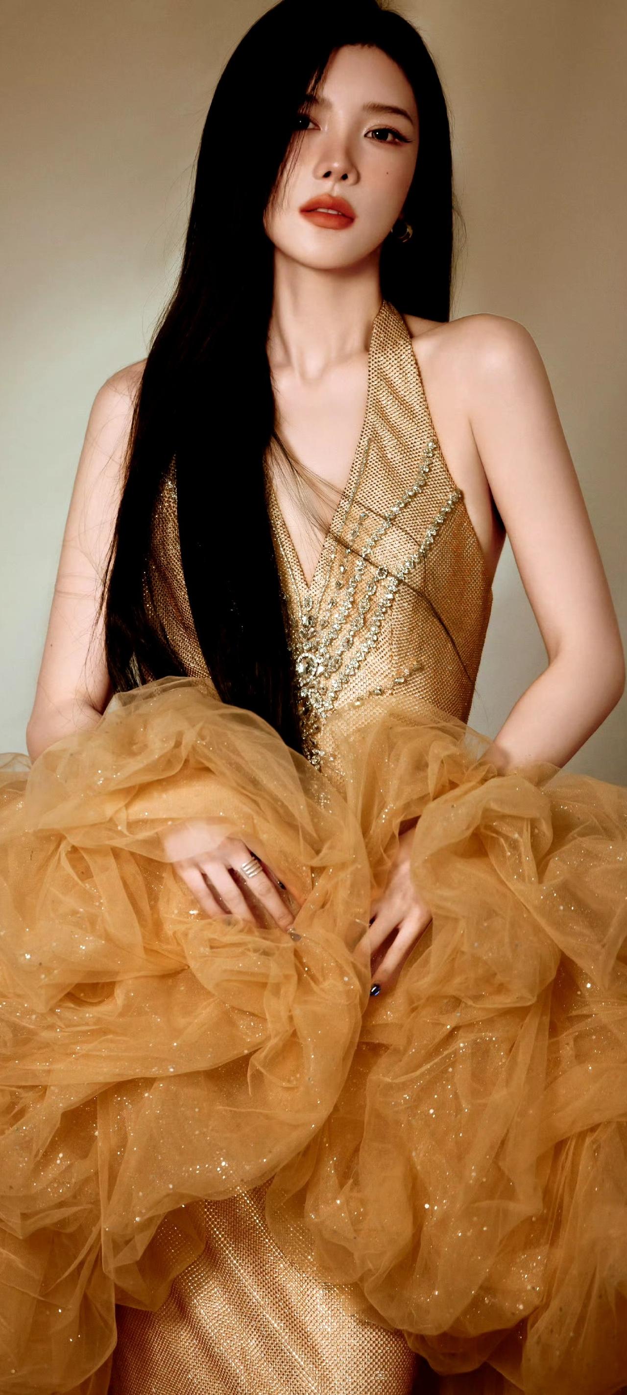 戴燕妮,优雅红唇,金色晚礼服,气质女神!