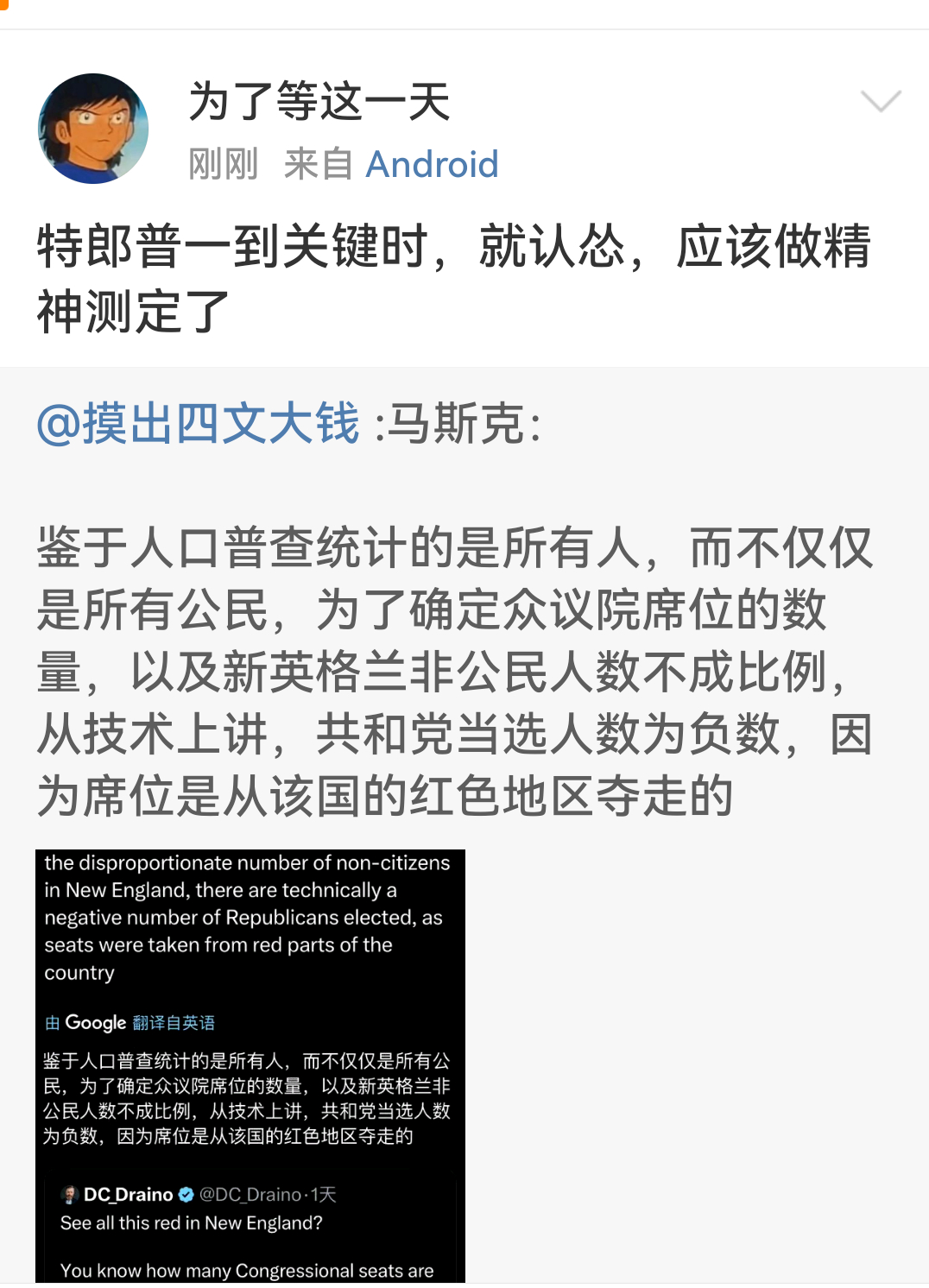 马斯克:鉴于人口普查统计的是所有人,而不仅仅是所有公民,为了确定众议院席位的数量