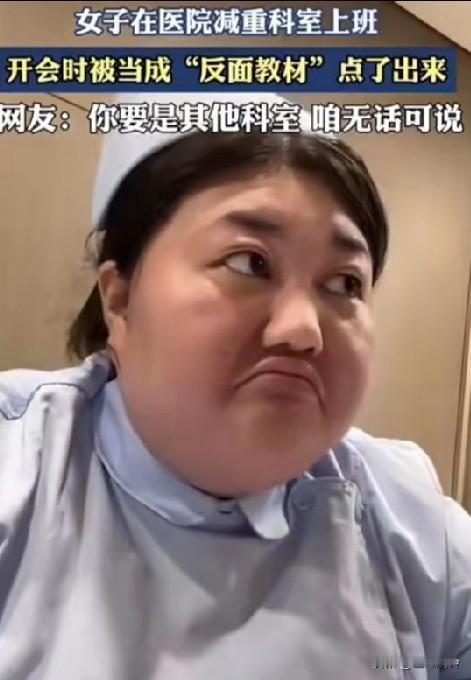 女子在医院减重科室上班,开会时被当做“反面教材”点了出来,这要是其他科室也无话可说 客户要是去减肥,看到这样的护士转头就走,感觉白花钱。你要是搞个瘦身案例嘛,到这个科室以前是坦克,现在是蛇精,证明这个科室相当合适。有些行业还是需要形象的,比如秃子治脱发。 有个精神病医院,是省里数一数二的,有个戒酒科, 也是很有名,治疗效果非常好, 可惜,他们的科主任,是个酒鬼,上班喝酒尿裤子