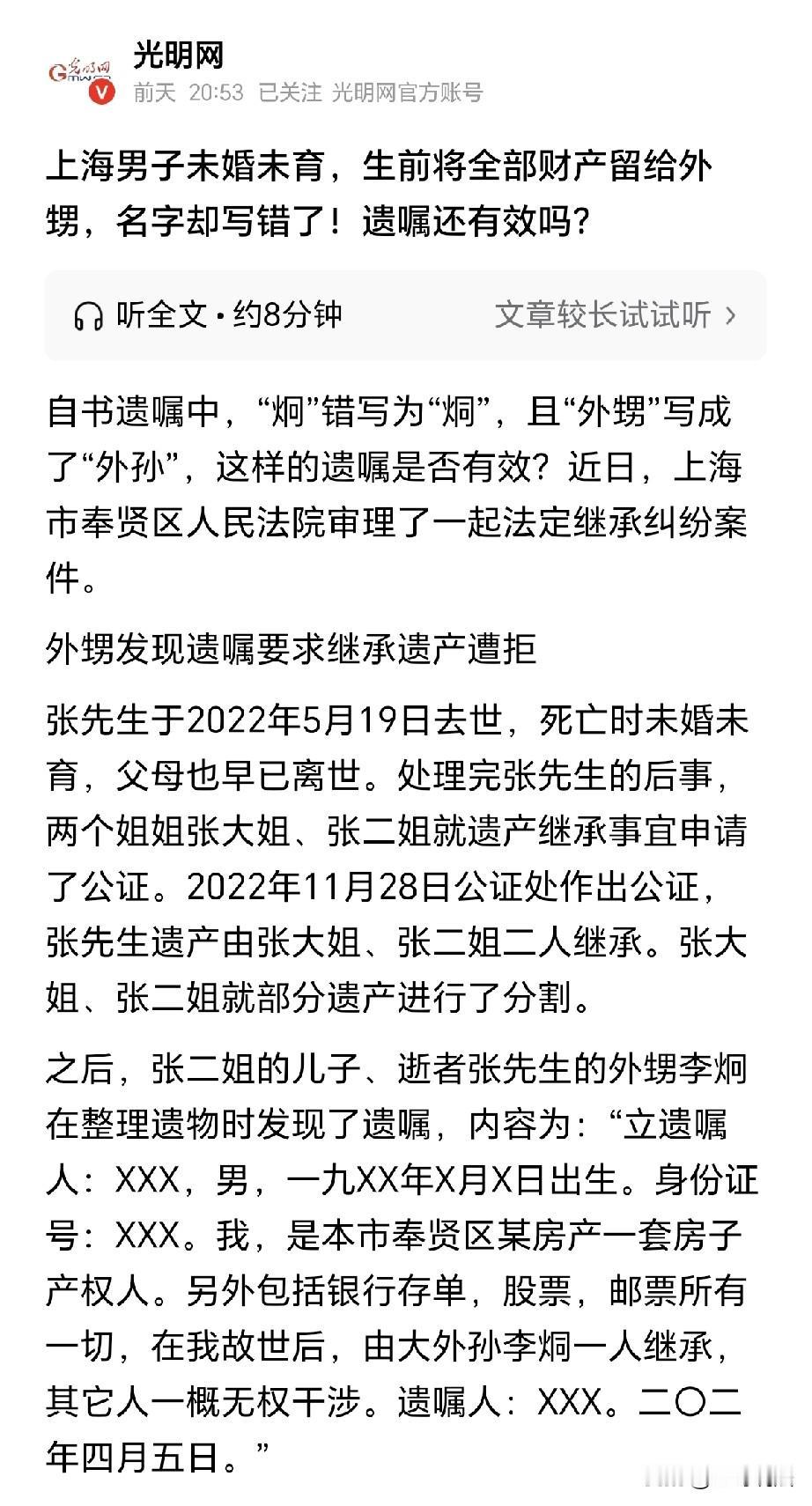 上海,一男子未婚,也没孩子,他去世之后,两个姐姐将遗产分了,谁知二姐家儿子整理舅舅遗物,突然发现舅舅留了一份自书遗嘱,遗嘱上写到: 全部遗产由大外孙“李烔”继承,而外甥名叫“李炯”,舅舅也没有外孙,外甥立刻联系大姨,说他愿意接受舅舅遗赠,可大姨反对,说名字不对,时间也不对,遗嘱上是“外孙”,并不是“外甥”,因此遗嘱无效,外甥看沟通无效,一纸诉状告到法院,结果令人意想不到! 张先生一生豁达,他未婚未育,年轻时日子过得十分潇洒。 可是转眼之间,他年纪大了,因为膝下无子,他的生活质量转而急下。 张先生有两位姐姐,两位姐姐早就成家,张二姐生了儿子李炯,李炯从小懂事,张先生对他十分的喜爱。 张先生有事,总要联系李炯,李炯是他的大侄子,在张先生心里,李炯就和儿子一样。 随着年龄的增长,张先生的身体每况愈下,他十分脆弱,到了最后,经常要去医院进行治疗。 可是他孤身一人,身边没有任何亲人,张大姐张二姐忙于家务,偶尔来探望弟弟,略待片刻,就要回家接着忙活。 而李炯最爱舅舅,从小舅舅待他不薄,如今也是他报答的时候。 从此以后,李炯只要有空,第一时间就到医院陪护舅舅。 张先生的病情时好时坏,看到李炯他就有了底气,在张先生心里,李炯就是他的后人,长久的陪伴让张先生无限的欣慰。 张先生开始考虑他的财产问题,他无儿无女,万一走的突然,一生的财产将如何处置。 可是他虽然有了想法,可谁也没有告诉说,2022年5月19日这天,张先生溘然长辞。 两个姐姐为他办理了后事,张先生生前,并没有表示,把他的财产留给谁来继承。 他无父无母,无儿无女,最亲的就是两位姐姐,其余再无别人。 因此,两位姐姐以第二继承人的身份,将张先生的财产进行了分割,并到公证处做了继承公证。 原以为事情就这么结束,谁知外甥李炯,他心里难过,日日思念,他再也不能看到最爱他的舅舅。 李炯开始整理张先生的遗物,睹物思人,他忍不住泪流满面。 可是他在收拾期间,突然发现了一份自书遗嘱,看到遗嘱上的内容,李炯鼻子一酸,又是泪如雨下。 原来,张先生在生前,早就对自己的财产做好了安排,他将自己的遗产,全部留给了外甥李炯。 医嘱上白纸黑字,清晰的写着: 将一套房子,银行存款,股票和邮票等等一切的财产,均交由大外孙李烔继承。 遗嘱的最后,有落款日期,舅舅写成了二0二年四月五日。 李炯冷静了一下,立刻将此事告诉了母亲,母亲张二姐心想,这事坏了,弟弟的遗产已经被她们姐俩通过公证继承给分了! 张二姐思前想后,还是把遗嘱的事告诉了张大姐。 张大姐匆匆赶来,她一看遗嘱,立刻就说遗嘱无效,这遗嘱上写的是大外孙李烔,而张二姐儿子名叫李炯。 也就是说,李炯并不是遗嘱上的李烔,他也不是外孙,而是张先生的大外甥。 张大姐又说,你看这最后的落款日期,二0二年四月五日,这个日期就有问题!哪里来的二0二年? 可李炯认为,舅舅文化水平不高,写错字在所难免,因为好多字他都不认识。 而且舅舅一生无儿无女,没有儿女,哪来的外孙? 李炯表示,他同意接受舅舅张先生对他的遗赠,可张大姐拒不认可,坚决认为这是一份无效遗嘱! 李炯看协商不成,一纸诉状告到法院,要求按照遗嘱继承舅舅的遗产。 那么,遗嘱中继承人名字、称谓写错,影响的遗嘱效力吗? 《民法典》第1134条规定: 自书遗嘱由遗嘱人亲笔书写,签名,注明年、月、日。 这条规定没说出现错别字就直接无效,关键看能不能确定遗嘱人的真实意思。 张先生把“外甥李炯”写成“外孙李烔”,但他根本没有外孙,也没有名字和“李烔”相近的亲属。 再结合他文化水平不高、沪语里“外甥”和“外孙”发音可能接近的情况,完全能确定他就是想把遗产给李炯。 所以这种笔误不影响遗嘱效力,法院因此,认可了这一点。 张大姐提出,遗嘱上的日期写错了,但日期写错,并不必然导致遗嘱无效,得看能不能确定真实日期。 法院经过调查,张先生的遗嘱里提到了房产等遗产,而这套房子是2020年才登记到他名下,说明遗嘱肯定是2020年之后写的。 “二0二年”明显是少写了“二”,实际应该是2022年,而且没有其他遗嘱和这份冲突。 因此,这份遗嘱能确定这是他真实的处分意愿,所以日期瑕疵不影响遗嘱生效。 《民法典》第一千一百二十四条规定: 受遗赠人应当在知道受遗赠后六十日内,作出接受或者放弃受遗赠的表示;到期没有表示的,视为放弃受遗赠。 李炯2023年3月11日发现遗嘱,3月13日就通过微信明确告诉大姨和母亲愿意接受遗赠,完全在60天的期限内。 大姨说他没及时表示,但拿不出证据反驳,所以李炯的接受行为是有效的,有权获得舅舅张先生的遗产。 最终,法院判决,由李炯继承张先生的所有遗产。 张大姐不服,提起上诉,二审维持了原判,驳回了张大姐诉求。 关注@王哥说法 多学法律少吃亏!
