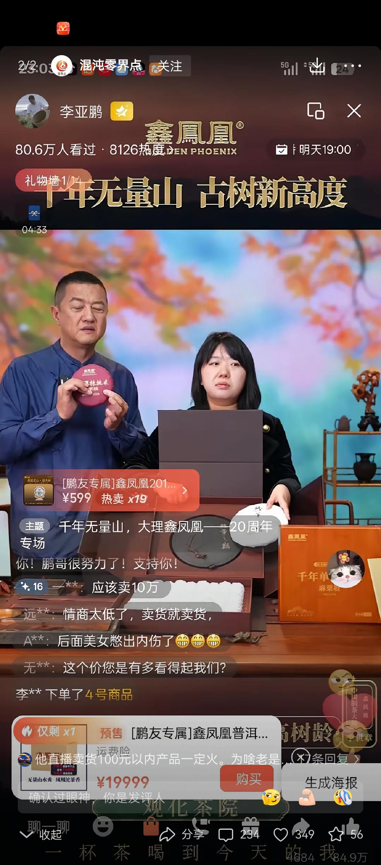 20000的茶叶, 李亚鹏的直播, 他娶过天后, 是个人物。。。 人家没有诈骗, 你觉得值你就买 真不年轻了。。。 李亚鹏