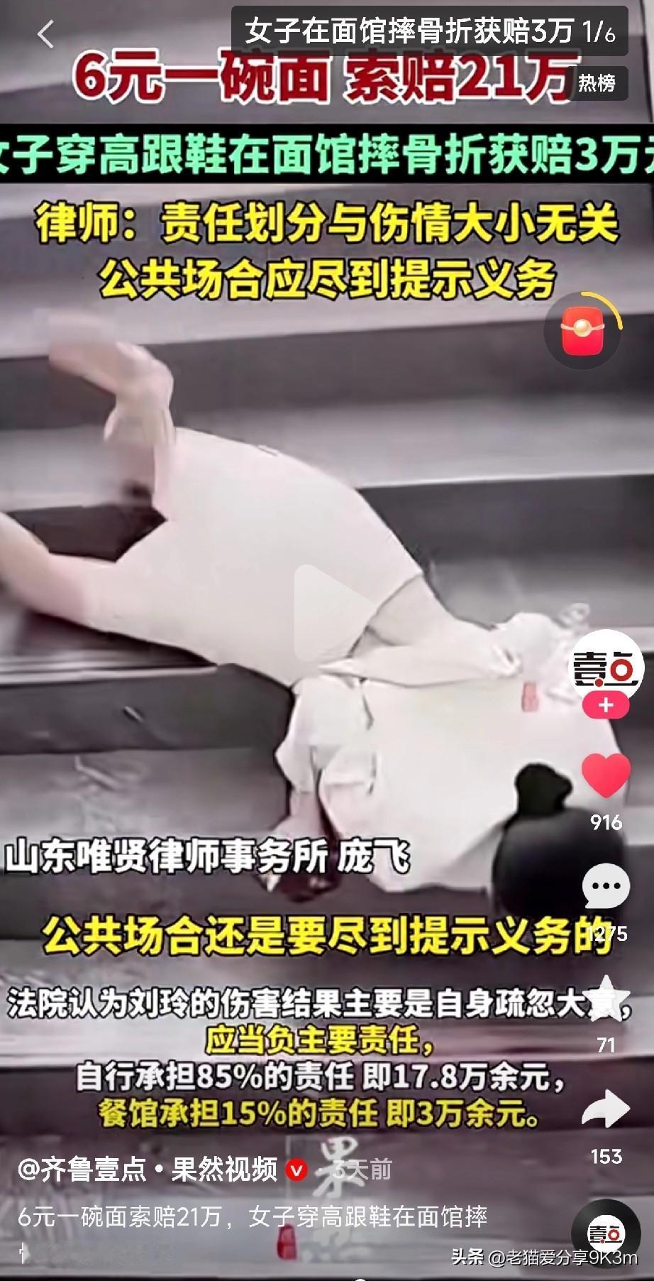 6块钱一碗面,最后却赔进去3万多?这事儿就发生在湖南一家普通面馆里! 当时刘女士穿着高跟鞋,端着一碗刚买的6块钱面条,转身回座位时没留意,在玻璃门的台阶上摔了个结实。谁曾想,这一摔竟然摔成了骨折,医药费一下子花了近18万。 她向面馆索赔21万,觉得店里台阶设计有问题。可法院判决让人大跌眼镜:刘女士自己得承担85%的责任,面馆只需赔3万多。 为什么?法官说了,伤情大小和责任划分是两码事! 律师朋友告诉我,别看赔得少,这个判决特别典型——公共场所确实要尽到安全提示义务,但咱们自己也得长点心啊!穿高跟鞋上下台阶,不注意看路,这风险本可以避免。 这事儿给所有人都提了个醒: 1、开店的朋友,一定记得在台阶、湿滑处放个警示牌,花小钱省大钱 2、爱穿高跟鞋的姐妹们,上下台阶千万小心,别让鞋子成了“凶器” 3、在外吃饭逛街,多留意脚下,别光顾着玩手机 真是应了那句老话:安全无小事,细节决定成败! 一碗6块钱的面条,吃出这么贵的“教训”,值不值? (文章素材来自齐鲁壹点.果然视频,侵删)