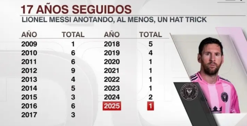 在今天迈阿密国际的比赛中,梅西迎来了2025年首个帽子戏法,从而延续了自己连续17年都有帽子戏法的记录,怪不得今天梅西没有让点了(此前联赛26球无一点球),原来是要延续自己的记录。