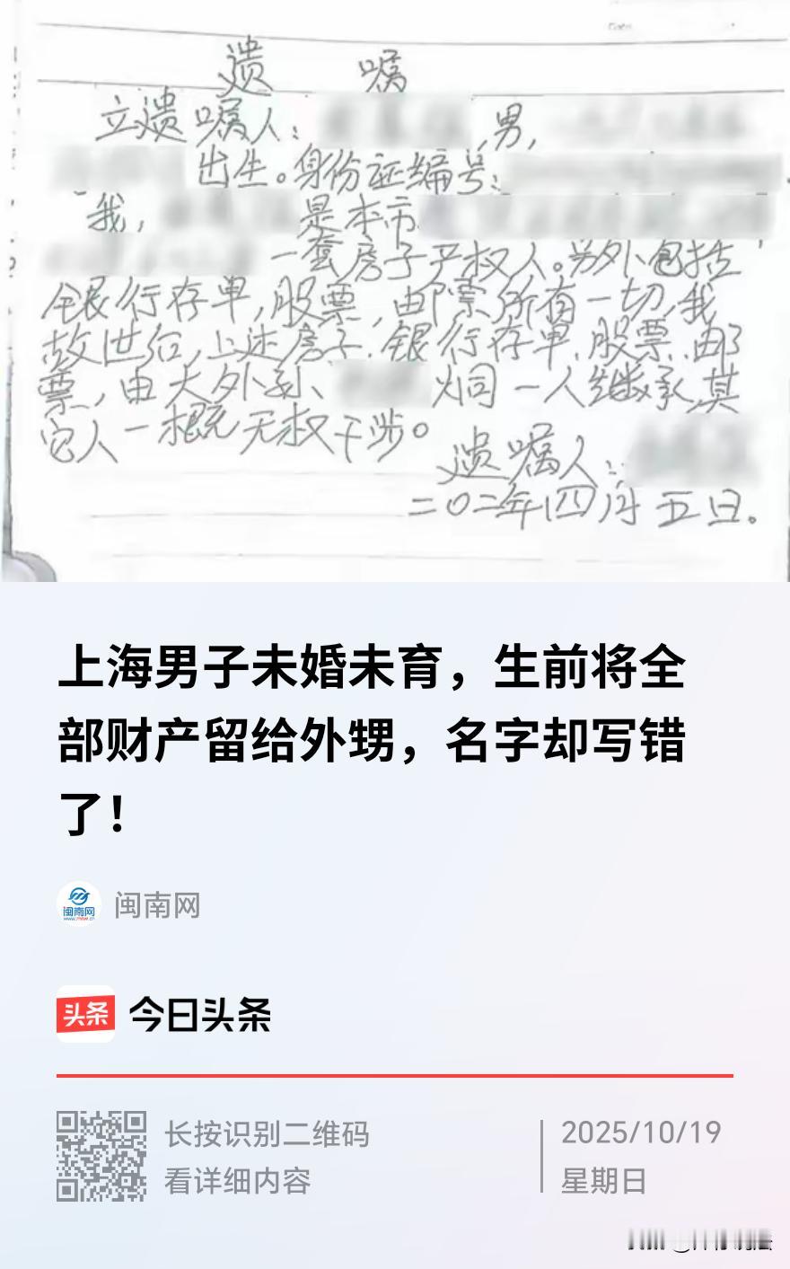 上海,一位单身舅舅去世后,外甥在整理其遗物时,在一本泛黄的集邮册里意外发现亲笔遗嘱,上面写着:“所有财产由大外孙李烔继承”。可外甥本名李炯,身份应是“外甥”而非“外孙”。外甥认为,这是舅舅的两处笔误,自己就是这份遗嘱指定的受赠人,第一时间表态接受遗赠。不料,两位姑姑不干了,她们认为这份连名字和关系都写错的遗嘱无效,要求按法定继承分割财产。无奈之下,外甥将姑姑诉至法院。法院这样判决。 张强(化名)一生未婚,也没有子女,父母早已过世,只有两个姐姐张大梅(化名)和张小梅(化名)。 张强性格内向,平时喜欢集邮、炒股,还拥有一套位于奉贤区的房产,他生活简朴,但对待亲人十分温和,尤其疼爱姐姐们的孩子。 2022年5月19日,张强因突发疾病不幸去世,他的离世让全家陷入悲痛,但生活还得继续。 处理完后事,张大梅和张小梅作为张强唯一的近亲属,开始着手处理遗产问题,她们通过公证处申请了法定继承。 2022年11月28日,公证处出具公证书,确认张强的遗产由两位姐姐平均继承。 随后,张大梅和张小梅分割了部分遗产,包括银行存款和邮票收藏,但房产暂时未处理。 万万没想到,张小梅的儿子、张强的外甥李炯(化名),在整理舅舅遗物时,意外发现了一张手写的纸条。 这张纸条夹在一本旧书里,纸张泛黄,字迹略显潦草。 李炯仔细一看,竟是一份遗嘱!内容写道:“立遗嘱人:张强,男,一九XX年X月X日出生。身份证号:XXX。我,是本市奉贤区某房产一套房子产权人。另外包括银行存单,股票,邮票所有一切,在我故世后,由大外孙李烔一人继承,其它人一概无权干涉。遗嘱人:张强。二〇二年四月五日。” 李炯愣住了,他名叫李炯,但遗嘱上写的是“李烔”,而且关系写成了“大外孙”,他明明是张强的外甥,不是外孙啊! 张强只有一个外甥李炯,没有其他叫“李烔”的亲戚,更别提外孙了。 李炯心想:这一定是舅舅笔误,他可能想留遗产给我,但写错了字。 于是,2023年3月13日,李炯通过微信联系母亲张小梅说:“本人于2023年3月11日发现遗嘱,本人接受遗赠。以下内容和图片麻烦转发给张大梅。”他随信发送了遗嘱照片。 张小梅很快将消息转给了姐姐张大梅。 没想到,张大梅坚决不认可遗嘱内容,她认为,弟弟张强从未向家人提过这份遗嘱,它藏得那么隐蔽,不足以反映真实意愿。 而且,遗嘱上错别字连篇“炯”写成了“烔”,“外甥”写成了“外孙”,落款日期“二〇二年四月五日”也写得含糊不清,像是少了“二”字。 张大梅坚持按公证结果继承遗产,拒绝李炯的请求。 李炯很委屈,将张大梅和张小梅告上法庭,请求法院判决由他继承张强的全部遗产。 法院会如何判决呢? 《民法典》第一千一百三十四条规定,自书遗嘱由遗嘱人亲笔书写,签名,并注明年、月、日。 法院指出,案涉遗嘱由被继承人张强亲笔书写、签名并注明了“二〇二年四月五日”,尽管年份“二〇二年”缺失了一个“二”字,存在书写不规范,但该瑕疵尚不足以否定其符合自书遗嘱的基本形式要求。 在能够通过其他证据印证遗嘱真实性的前提下,微小的形式瑕疵不应成为否定遗嘱效力的决定性因素。 而且,对遗嘱内容的解释,应遵循探求遗嘱人内心真意的原则,而非拘泥于个别文字的表面含义。 张强未婚未育,并无子女、孙子女,事实上不可能存在“外孙”。相反,其与外甥李炯之间存在亲密的甥舅关系,且李炯是张小梅之子这一事实确凿无误。 在此背景下,将“外孙”解释为对“外甥”的误写,符合家庭亲属关系的客观情况。 此外,在张先生的社会关系网络中,并无其他名为“李烔”或发音相近的亲属或关系人。而李炯是唯一与其名字高度近似且存在亲属关系的自然人。 考虑到张先生的受教育程度以及沪语发音中两字可能存在混淆,此种笔误在生活中实属常见,并不足以产生合理怀疑。 而且,遗嘱中明确表示“所有一切”均由“大外孙李烔一人继承,其它人一概无权干涉”。这一表述清晰、斩钉截铁,排除了其他法定继承人即两位姐姐的继承权。 此外,《民法典》第一千一百二十四条第二款规定,受遗赠人应当在知道受遗赠后六十日内,作出接受或者放弃受遗赠的表示…… 法院进一步指出,李炯主张其于2023年3月11日整理遗物时才发现遗嘱,并于3月13日通过微信向其母亲和大姨张大梅作出了接受遗赠的明确表示。 为证明此事,李炯提供了微信聊天记录作为证据。 张大梅对此提出异议,但根据谁主张、谁举证原则,张大梅未能提供任何有效证据来证明李炯在2023年3月11日之前就已经知晓该遗嘱的存在,应承担举证不能的后果。 最终,法院认定遗嘱合法有效,判决被继承人张强名下位于奉贤区的房产等案涉遗嘱所列全部遗产,由李炯继承。 对此,您怎么看?