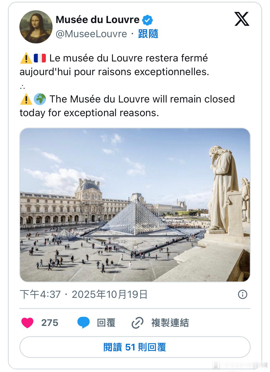图:抢案发生后,罗浮宫紧急关闭,原本已经在馆内的民众被锁在里面。 (图翻摄自X平台)卢浮宫[超话]