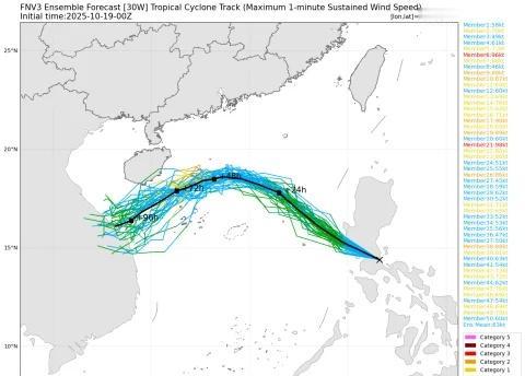 台风风神今晚进入南海,路径略有调整 目前依旧位于菲律宾吕宋岛上台风风神,强度维持变化不大,今晚进入南海。路径方面根据AI模型歌谷fnv3来看,略有调整,略有北调,主要原因实况走向要比预期走的偏西偏南。明后天稳定朝北偏西方向移动,21日夜里与南下冷空气相遇,路径转为西南偏西,22日较大概率从海南南部近海擦过。强度方面未来增强可达强热带风暴或台风级11~12级。天气 台风