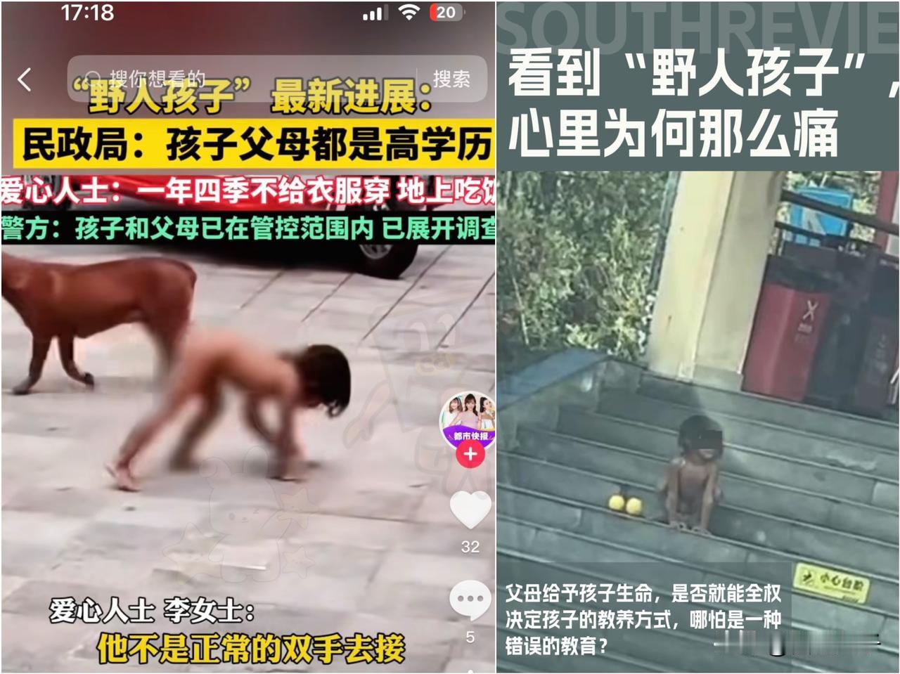 “野人小孩”的父亲是一个狗场的老板,母亲是研究生学历,两人有一个很大的养狗场,厂里还养有马,更离谱的是 明明家附近就是幼儿园,大孩子却常年光身子、行为怪异,小孩子虽穿衣服,也没享过正常童年。孩子没户口,有人劝阻、报警,家长竟拿“生活方式”当挡箭牌,连政府沟通都拒不配合。 别拿“自由”当借口,为人父母最基本的责任是给孩子安全和正常成长环境,不是把他们困在自己的偏执里。高学历不代表有合格的育儿观,若母亲真有精神问题,更该优先保障孩子权益,而非放任不管。 总之,孩子是无辜的,愿早日查清事情真相,让孩子回归正常生活,对此大家怎么看?
