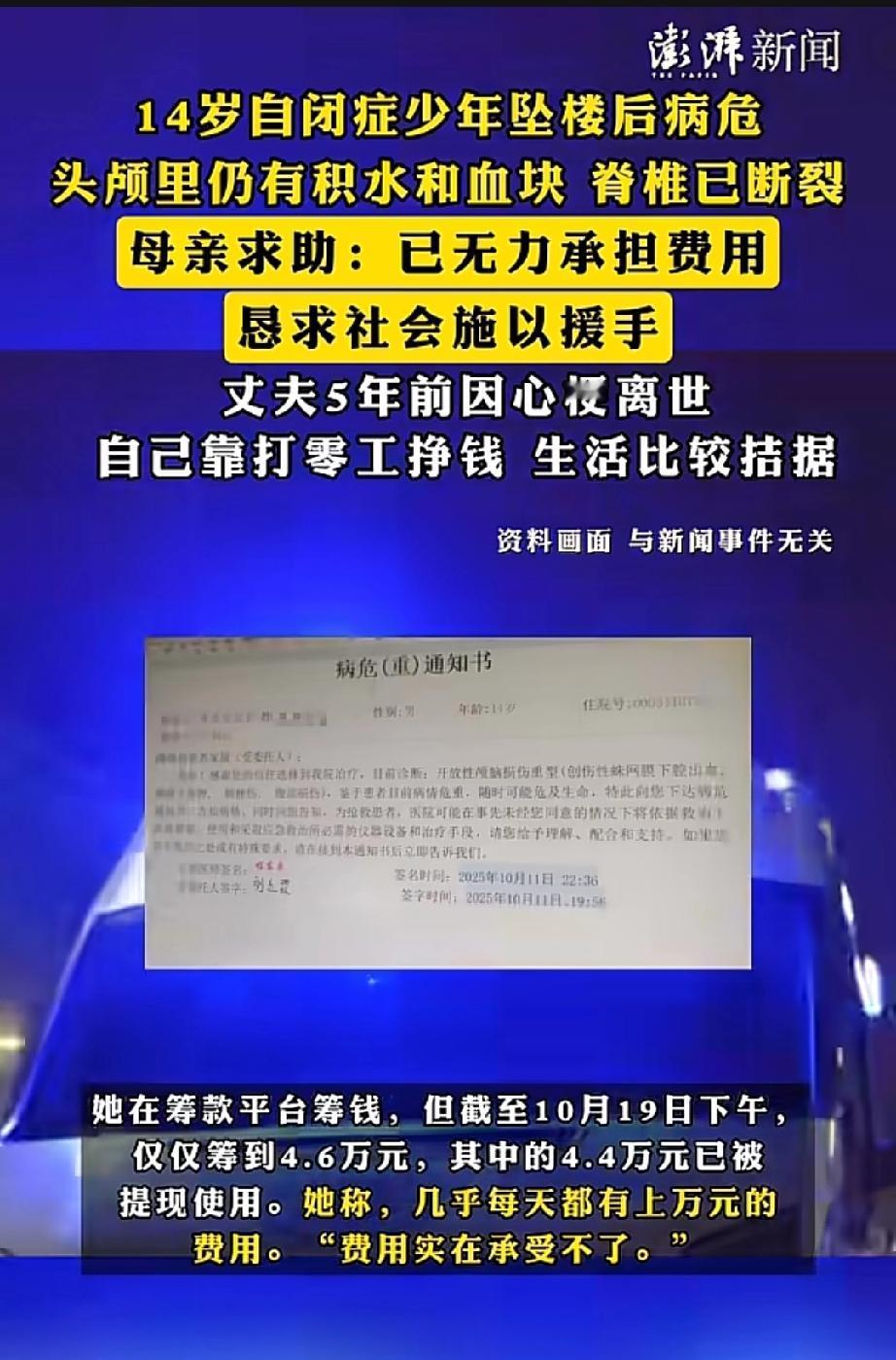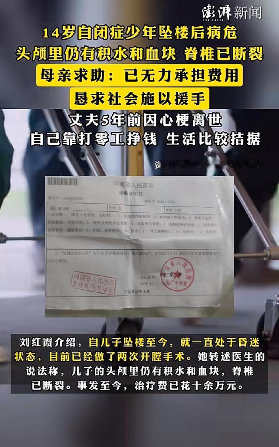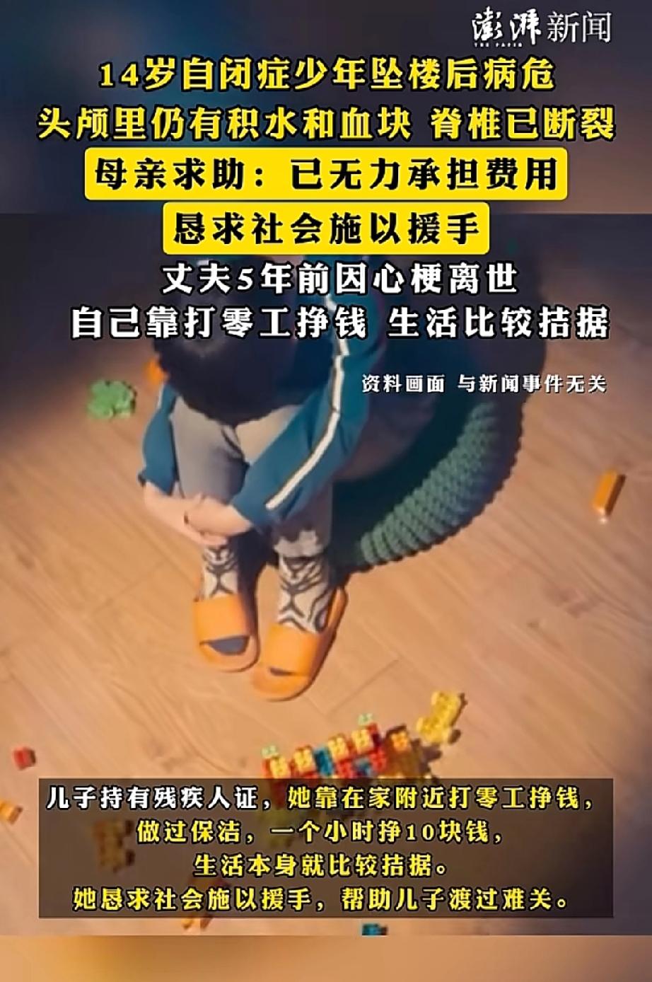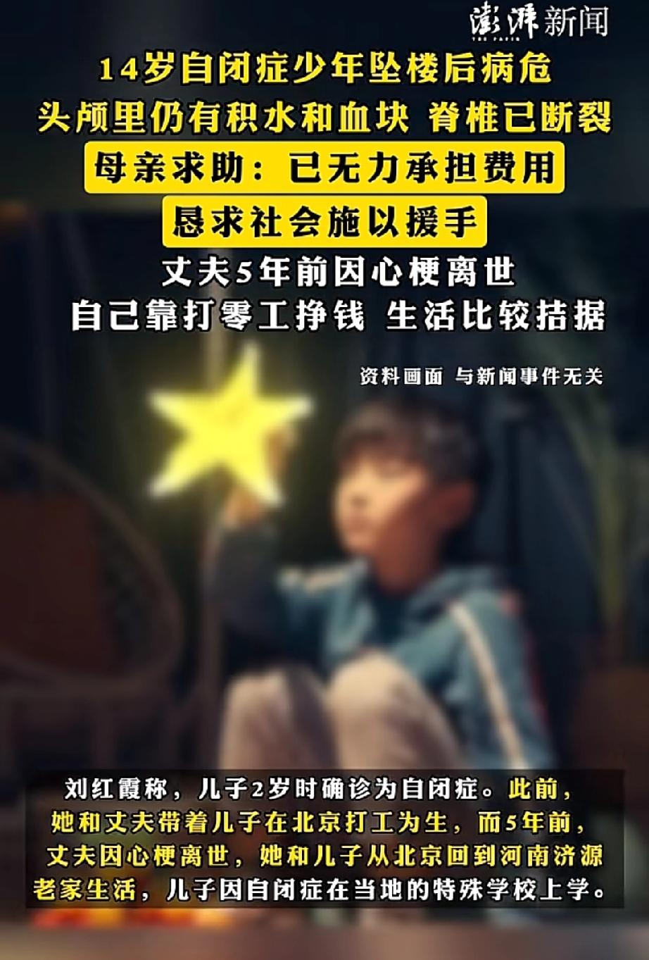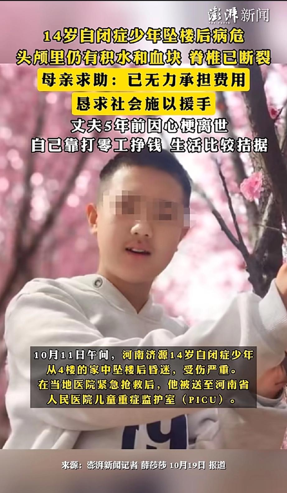 河南一名14岁自闭症少年从自家四楼坠落,头部受伤昏迷,脊柱断裂。短短九天,治疗费就花了10余万。 这名少年两岁时被确诊自闭症,曾随父母在北京生活。 五年前父亲因病离世,母亲便带他回到河南济源老家。 少年在当地特殊学校读书,母亲靠打零工维持两人生计。 10月11日下午,母亲外出工作,少年意外从家中坠落。 目前,少年在河南人民医院儿童重症监护室。医院已为其进行两次开颅手术,他仍处于昏迷状态。 医生说,他的脑子里还有积水与血块。 由于生活窘迫,母亲在少年入院后便在网上发起众筹,筹得4.6万元,已提现4.4万支付医药费。 母亲通过媒体恳请网友施以援手。 母亲为少年上新闻选的照片里,少年身着白色卫衣,站在粉色桃花下微笑着。 看得出这是个漂亮的孩子,母亲舍不得他离去。 虽然他是自闭症少年,但每个生命都值得被温柔以待。 来源:澎湃新闻