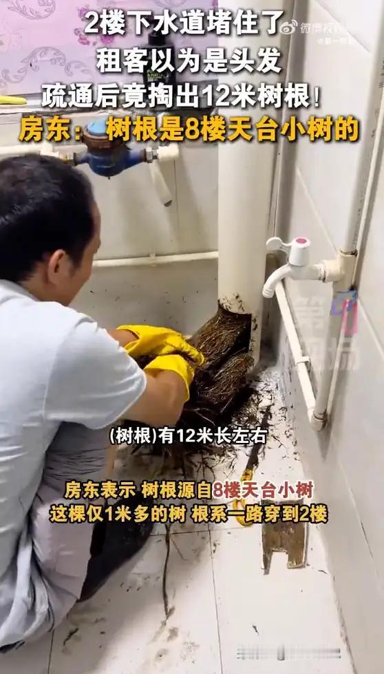 广东深圳一栋居民楼二楼租客发现家里下水道堵了,怎么通都不行,结果请人来一疏通,好家伙,直接掏出一大堆树根,连起来足足有12米长! 房东一查才发现,这些树根竟然是从八楼天台一棵小树长下来的。这棵树不高,就一米多,可它的根特别能钻,顺着下水管道一路往下长,硬是从八楼穿到了二楼。 房东说,这棵树不是人专门种的,可能是小鸟吃了种子,飞过来排便时把种子带到了天台上。结果种子发芽后,树根拼命往下水道里钻,把管道堵得严严实实。 这种树根特别厉害,能穿透水泥墙和管道。广东其他地方也发生过类似的事,有的树根甚至长到30米,把整栋楼的下水道都占满了。 修管道的师傅说,遇到这种情况只能把树根清理干净,再把树移走。有些小区因为树根破坏太大,住户还吵过要不要砍树。