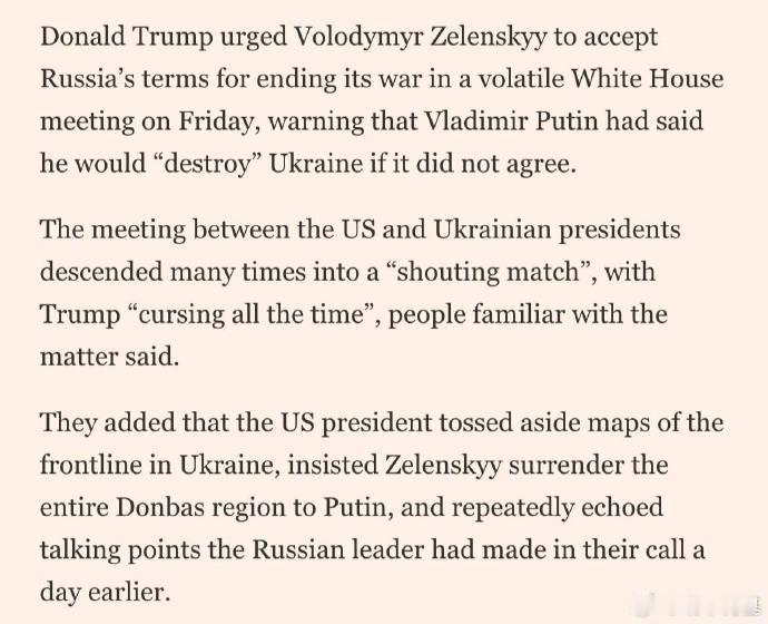 据《金融时报》报道,特朗普在最近与泽连斯基会晤时敦促乌克兰接受普京的条件,否则将面临毁灭。 这次会晤演变成了一场“争吵”,特朗普扔掉了乌克兰前线的地图,并嘟囔:“我厌倦了一遍又一遍地看乌克兰前线的地图,这条红线,我甚至不知道它在哪里。我从来没去过那里。” 特朗普还承认俄罗斯经济并未崩溃,而是“表现良好”。