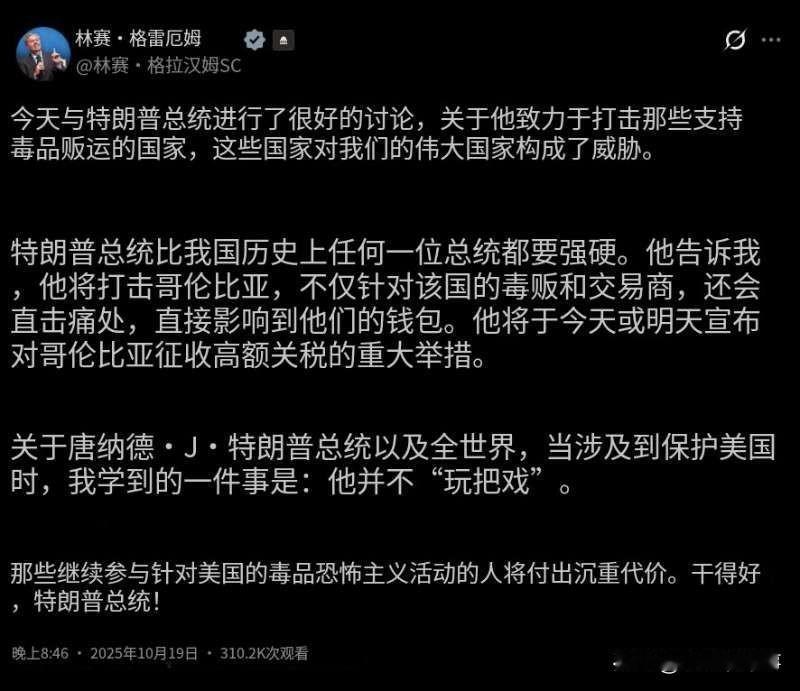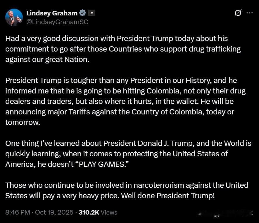 美国共和党参议员林赛·格雷厄姆表示,特朗普总统将于10月19日(周日)或20日宣布对哥伦比亚实施“重大关税”,原因是他们支持“针对美国的毒品恐怖主义”。 美国特朗普关税 特朗普征加关税 特朗普增关税 特朗普关税方案 特朗普加增关税 特朗普美国关税 特朗普关税法案