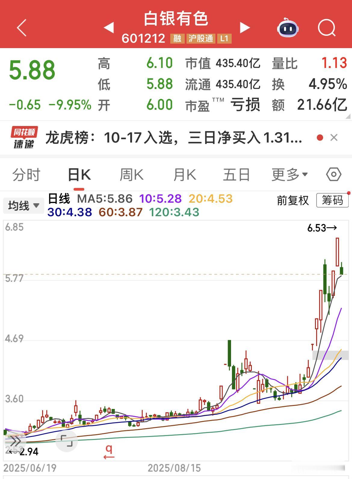 白银有色:上一个交易日涨停,今日跌停! 在亏损股,玩击鼓传花,胆子真大!