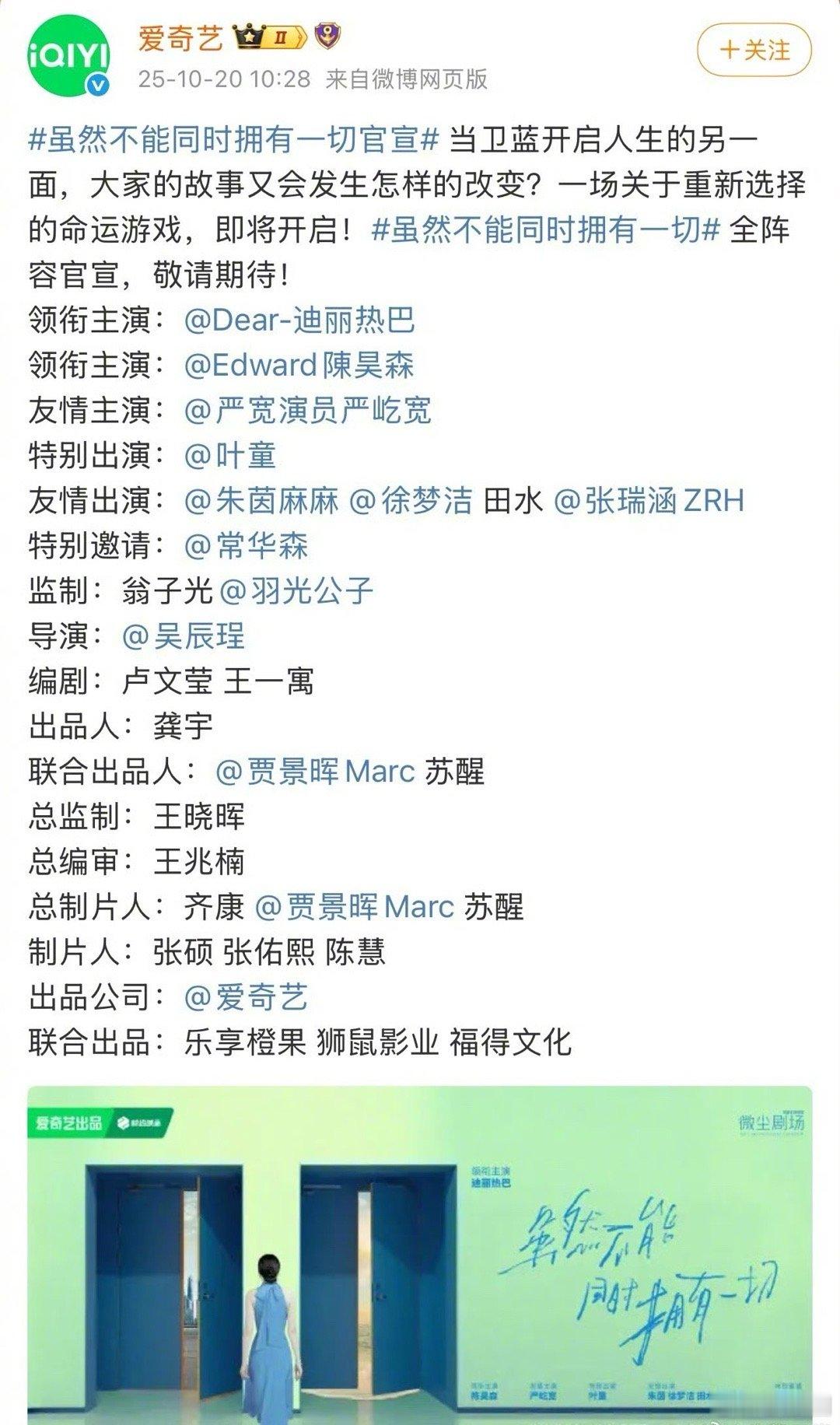 虽然不能同时拥有一切 官宣领衔主演迪丽热巴、陈昊森,期待嘛~