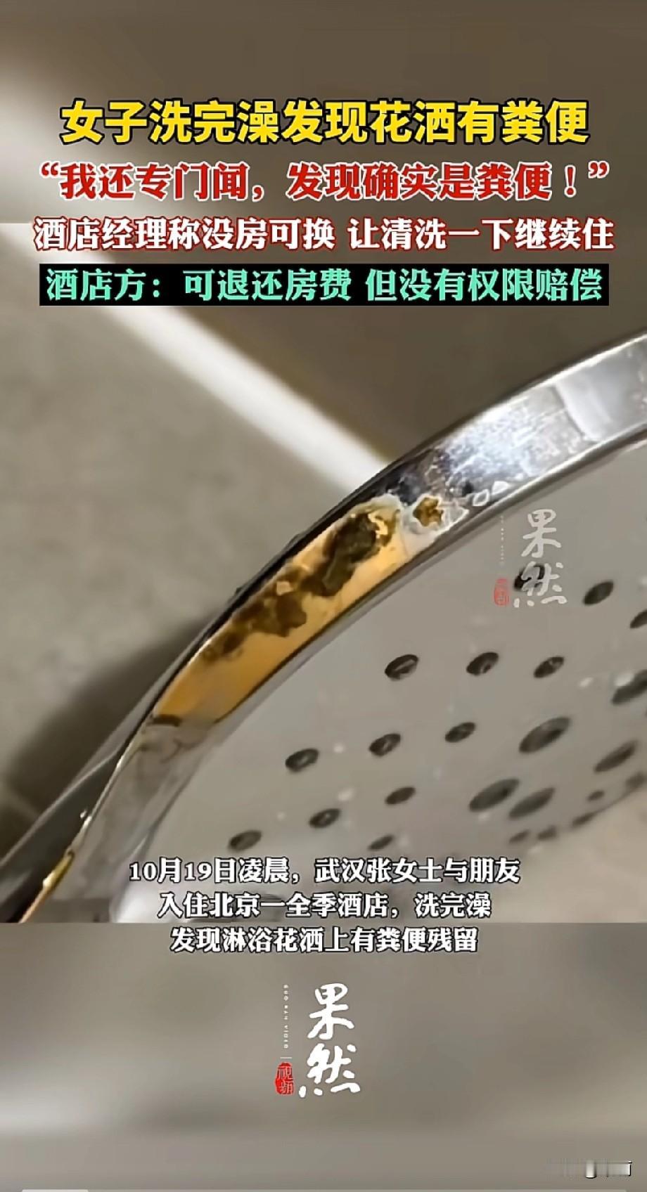 10月19日凌晨,武汉张女士和朋友花678.26元订了北京全季酒店安定门店的房,朋友洗完澡发现花洒上有粪便残留。联系前台后,工作人员竟只说让保洁清洗继续住,张女士反对后才换了空房,傍晚店方说能退房款,但赔偿要等上级回复。 这不是个例,7月长沙张女士住锦江之星,洗澡也在花洒上发现疑似粪便,酒店店长还称入住前房间没问题,不承认不赔偿。 花几百块住酒店,连基本卫生都保证不了,太离谱。业内说这是酒店控成本、管理差,监管也没跟上。遇到这种事别忍,先拍照留证,再找酒店协商,不行就打12345投诉。希望酒店真能好好管卫生,监管也别缺位,不然谁还敢住。