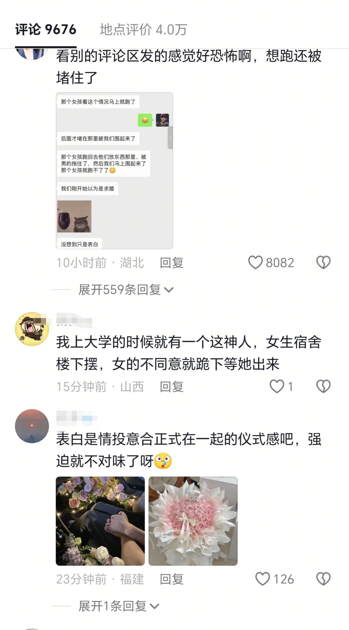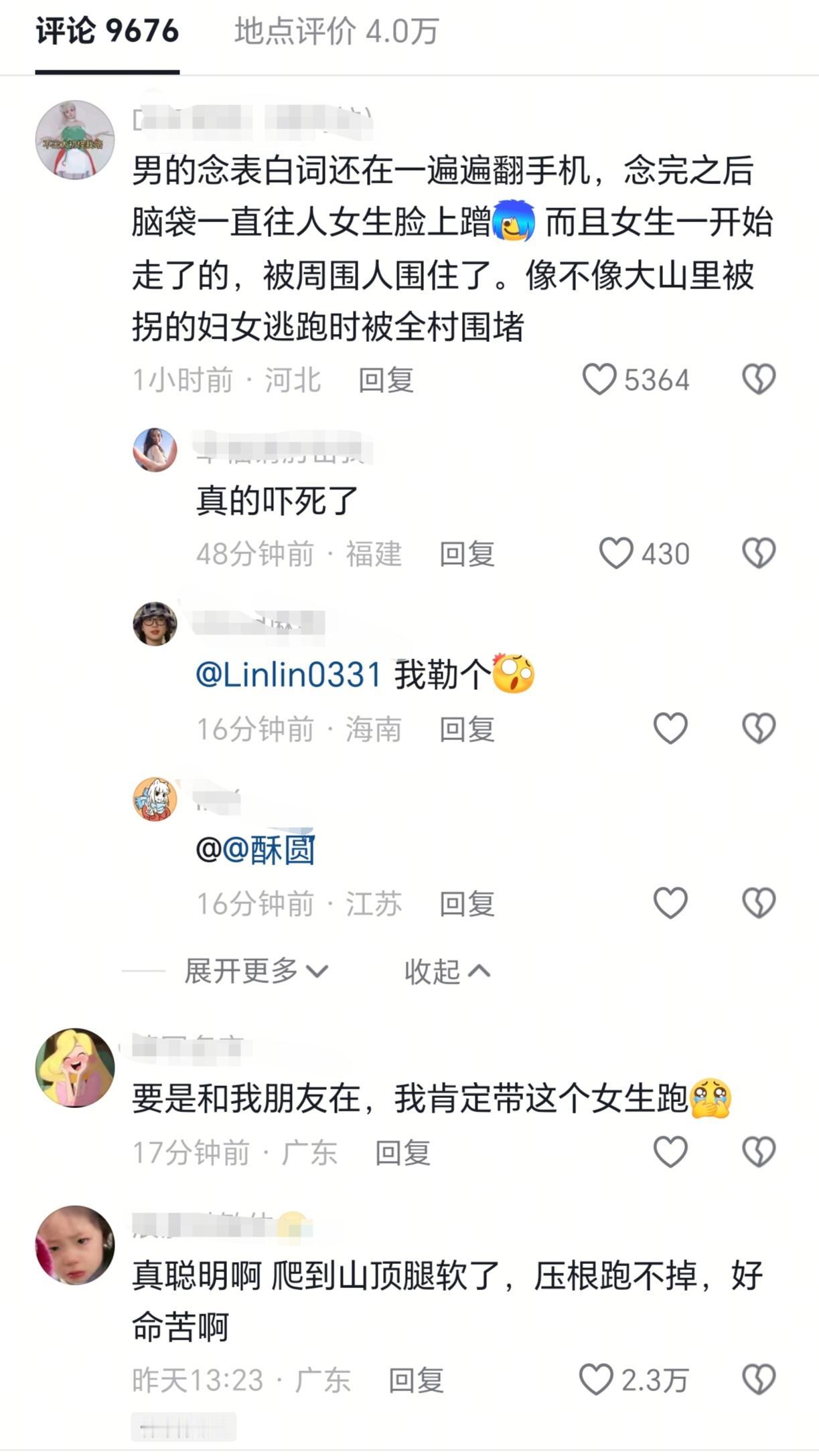 一男生和女生一起爬梧桐山,爬到顶后,男生手捧鲜花,直接就对着同行的女生进行了表白。可能都是第一次看到这种场面,没一会儿周围就围满了路人。在路人的起哄之下,男生对着手机读起了表白稿[捂脸]。但是女生似乎全程低着头,捂着脸,不说话,自己搁那刷手机。 感觉女生可能都有心理阴影了,被这么多人围着,想走也走不了。表白这种东西,最好是两者之间已经明确要在一起了,然后男生也想走个仪式感。这种突然表白,也不知道对方的想法的行为,实在是不可取。没准爬完山后,就会被对方拉黑[笑哭]。表白