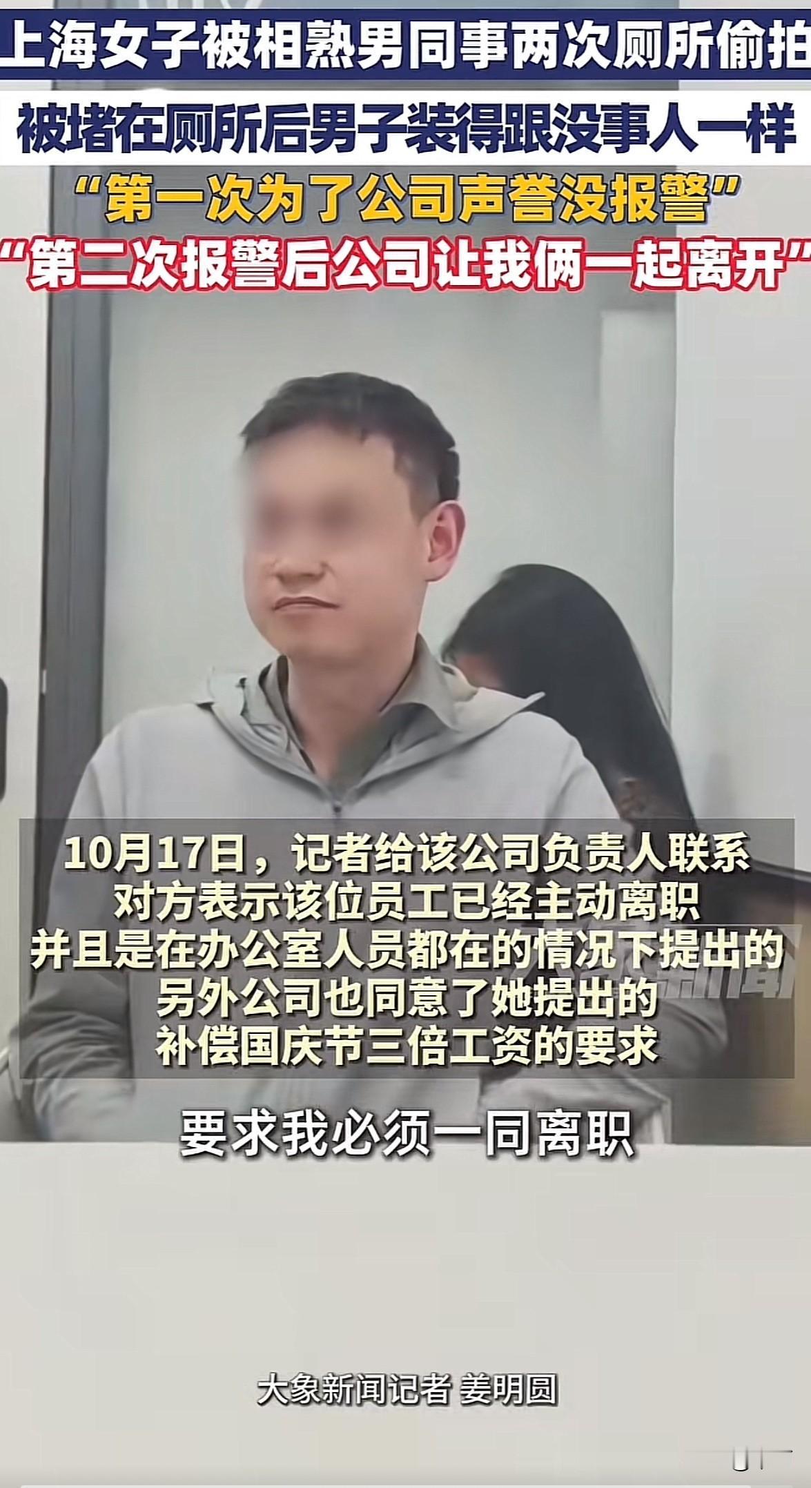 上海周女士5月在公司女厕被同事李某偷拍,堵到对方后没报警,公司调解下李某赔了1万还写了道歉书。 8月李某又偷拍,周女士直接报警,警方查实后对李某行政拘留7天、罚款300元。 没想到公司说让李某9月返岗月底再辞退,还说周女士不同意就得一起走。10月周女士没法子,和公司协商后离职了。 偷拍两次已经违法,公司本该严肃处理维护员工权益。反而和稀泥,逼受害者离职,这操作太让人寒心。 职场隐私被侵犯,受害者不该沉默,该报警就得报警。企业更得有底线,要是只讲利益不讲对错,怎么留得住员工?