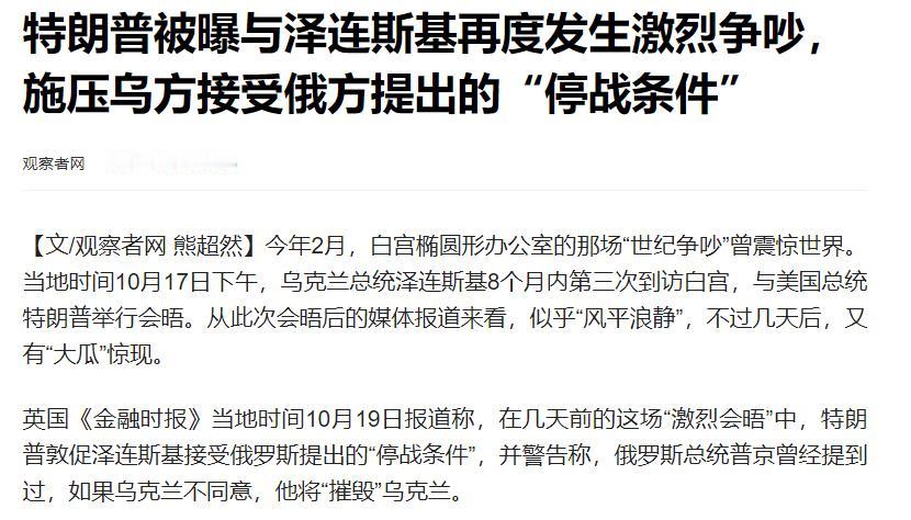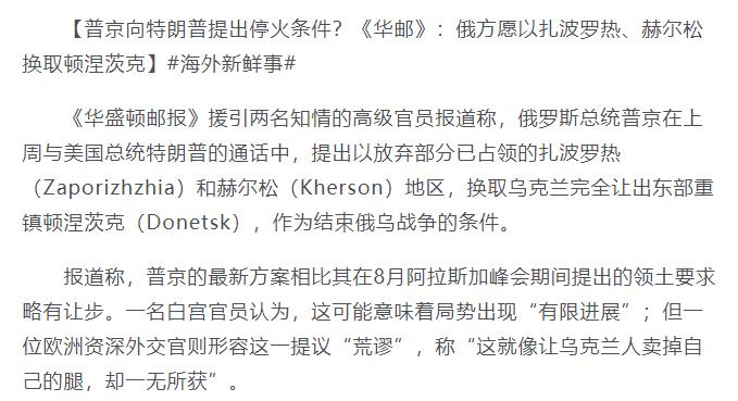 乌克兰做梦也想不到,俄罗斯居然会要求割土求和。 据《华盛顿邮报》从两位知情高官那里得到的消息,俄罗斯总统普京上周和美国总统特朗普通电话时,提出了一个新的停火方案:俄罗斯愿意放弃一部分之前占着的扎波罗热和赫尔松地区,但作为交换,乌克兰得把东部的重要城市顿涅茨克完完全全让出来。 这消息一出来,不少人都觉得这局势真是越来越让人看不懂了,毕竟之前双方在战场上一直僵持不下,现在突然冒出这样的条件,确实挺出人意料的。 其实稍微想想就能明白,跟俄罗斯之前提出的要求比,这次已经算是退了一大步了。现在战场上,俄罗斯在不少地方还占着优势呢,这种时候让他们空手而归、从乌克兰撤军,根本不现实。所以提出用土地换土地的办法,也算是在情理之中。 要知道扎波罗热和赫尔松这两个地方,之前一直被俄罗斯牢牢控制着,现在愿意放弃部分区域,说明俄罗斯确实有想结束这场冲突的意思。不过这让步也不是没有底线,顿涅茨克对他们来说显然是志在必得,不然也不会拿出两个地区的部分控制权来换。 但就算俄罗斯退了一步,乌克兰总统泽连斯基肯定也不会轻易点头。 英国《金融时报》10月19日报道称,几天前特朗普和泽连斯基也进行了通话,两人谈得特别激烈,特朗普一个劲儿地劝泽连斯基接受俄罗斯的条件,结果两人没谈拢还吵了起来。 这也不难理解,顿涅茨克对乌克兰来说太重要了,它是乌克兰东部的工业重镇,人口有一百多万,而且煤炭、钢铁产量在乌克兰都是数一数二的,要是把这么重要的地方让出去,不光是领土完整受影响,国家经济也得跟着受重创,泽连斯基怎么可能轻易答应呢? 而从冲突一开始,乌克兰就一直说要守住每一寸土地,且北约国家也一直在支持他们。就在10月16日,乌克兰还和西方盟友达成了新的援助协议,光军事和产业援助就超过10亿美元,瑞典更是说要在2026到2027年给乌克兰80亿美元的安全援助。 现在,泽连斯基面临着国内老百姓和国际社会的双重压力。在领土问题他上根本没法轻易松口,但不让步这仗目前又没有打赢的势头,继续下去乌克兰的损失只会越来越多。 特朗普这边又着急让双方停火,一个劲儿地劝泽连斯基接受条件,这也能看出来美国想尽快结束这场冲突的心情。可美乌在这问题上的分歧太大,反而让局势更复杂了。 现在最核心的问题还是领土,俄罗斯想要顿涅茨克,乌克兰死活不肯让,就算俄罗斯让了步,双方在这事儿上还是谈不拢。就目前这情况,估计短时间内还停不了,这拉锯战怕是还得持续一阵子。