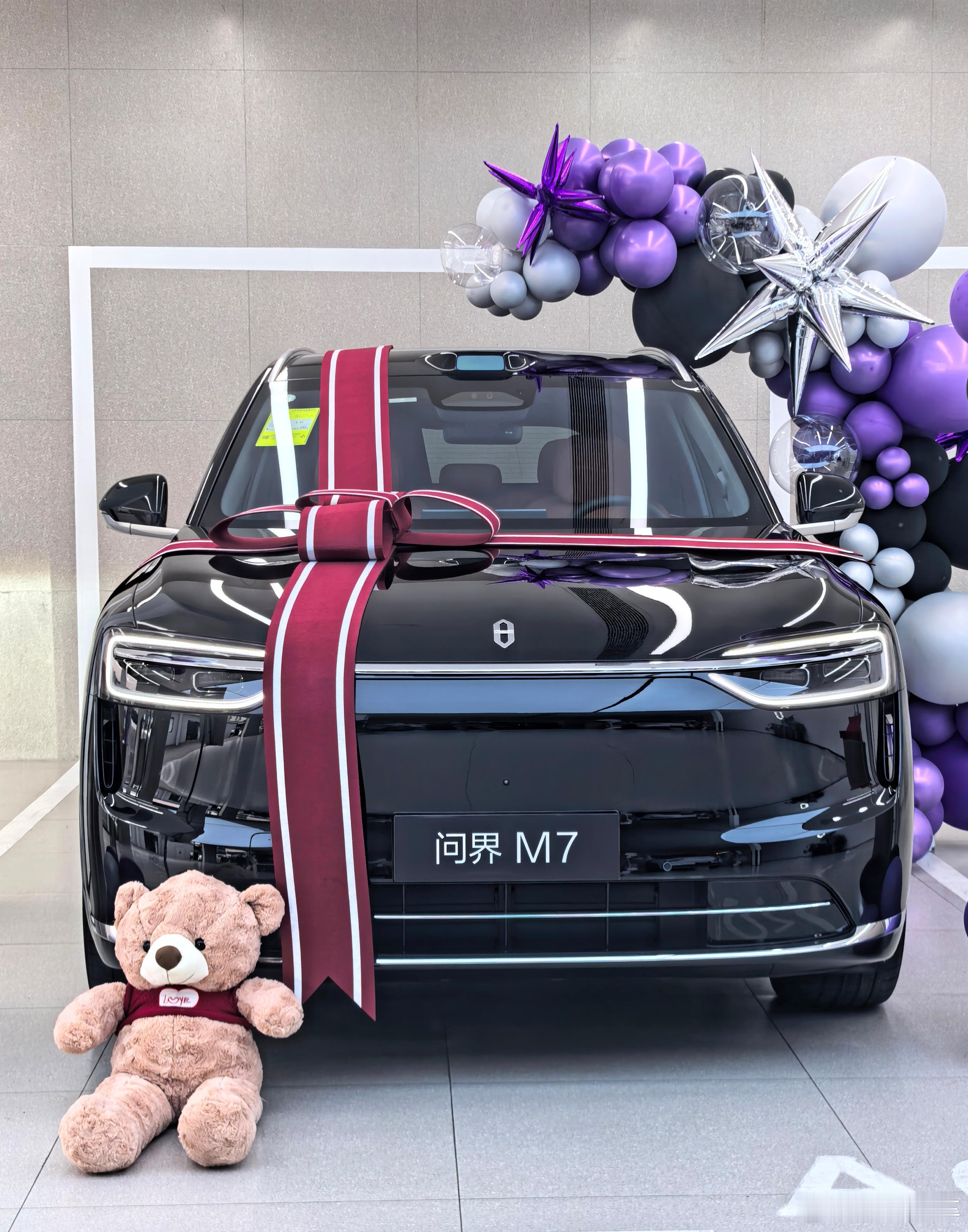 提车还准备了这么可爱的一只小熊,和我的酷酷的车莫名形成一种反差萌,布置现场看出来很用心了[爱你]全新问界M7我和汽车的日常