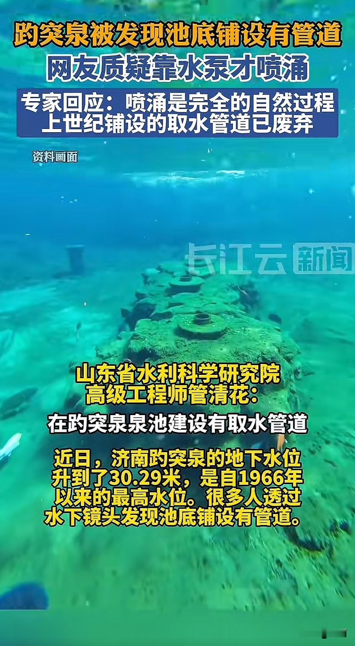 趵突泉水位突破30米,不少人从水下镜头看到池底有管道,网传“靠水泵人工造景”的说法引发热议。 景区回应水下没有水泵,那些是钢制井管。有的是上世纪水厂遗留的废弃取水管道,有的是2003年复涌后加装的。作用是加固泉口地质,防止岩石崩塌,还能拦截泥沙避免堵塞泉眼。 专家也说了,泉水喷涌是自然现象。济南特殊地质让地下水受压涌出,日出水量最高8.9万立方米,靠水泵维持根本不现实。 这事其实是大家对设施不了解才起了疑心。景区把管道用途、水位数据都公开,谣言自然就散了。咱们看景观还是得多信科学和官方信息,别被不实猜测带偏。