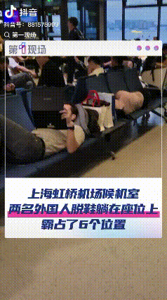 “中国不欢迎这样的你!”上海虹桥机场,有俩外籍男子直接把鞋脱了,横躺在候机厅的座