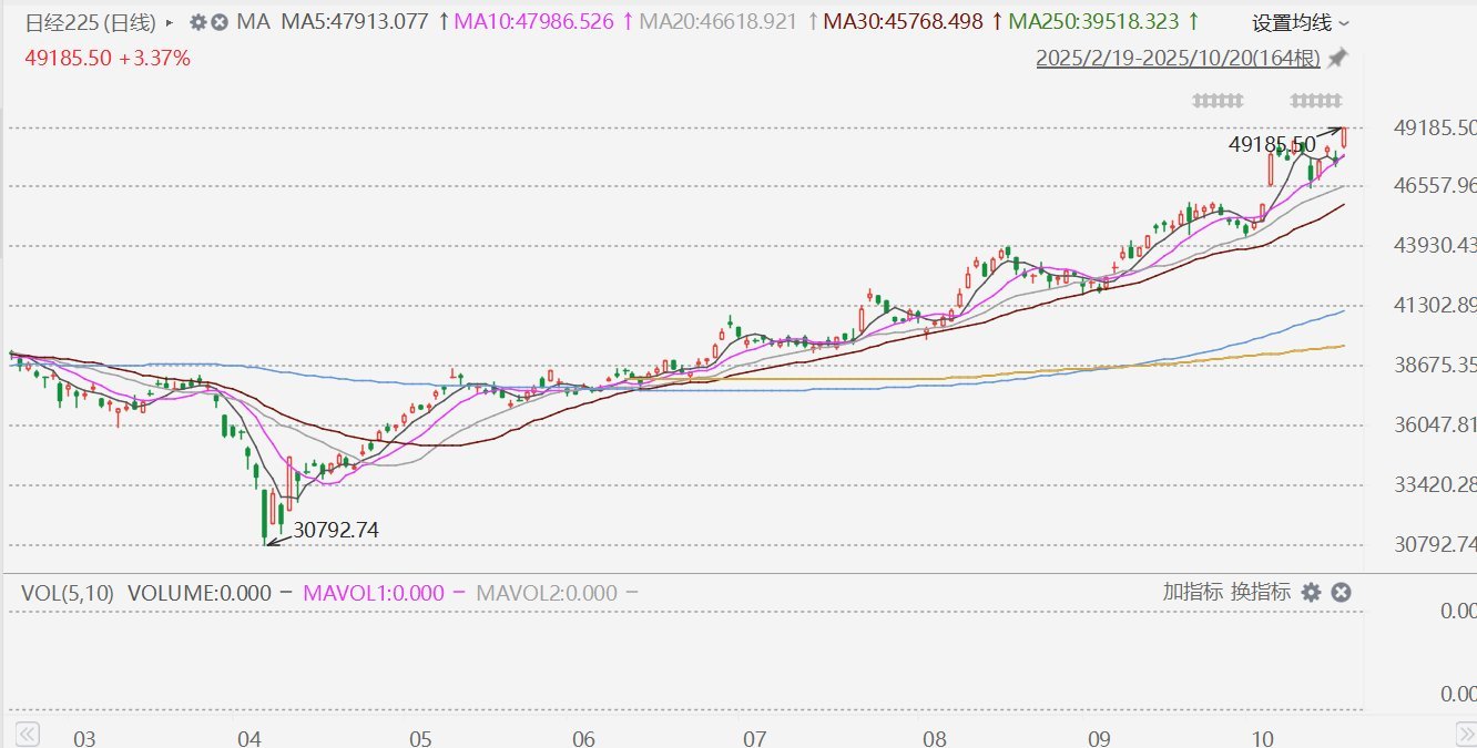 【日经225指数涨逾3%创历史新高 年内累涨23.29%】日韩股指收高 高市早苗出任首相之路几成定局,日股大涨。10月20日,日经225指数10月20日(周一)收盘上涨1603.35点,涨幅3.37%,报49185.50点。韩国KOSPI指数10月20日(周一)收盘上涨65.79点,涨幅1.75%,报3814.68点。