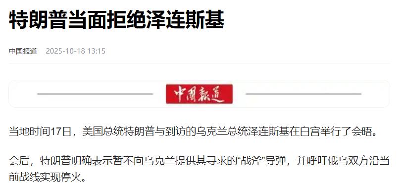 乌克兰想不明白美国在怕什么! 就在当地时间10月17日,泽连斯基第三次跑到白宫见特朗普,本以为能拿到心心念念的“战斧”导弹,结果特朗普直接泼了冷水——暂时不给,还呼吁俄乌沿着现在的战线赶紧停火。 这话一出,乌方当场就炸了锅,泽连斯基跟特朗普吵得面红耳赤。按乌克兰的想法,西方媒体都算过了,照俄军这一个月的推进速度,想占了整个乌克兰得花100多年,现在正是要硬家伙撑场面的时候,美国这时候掉链子,实在让人想不通。 泽连斯基甚至在会谈里拿出地图,指着俄罗斯境内的军事目标说,有了“战斧”就能打这些地方逼俄罗斯谈判,可特朗普就是不松口。 其实乌克兰压根没琢磨透,美国做决定从来不管别人怎么想,只盯着自己的安全利益。 之前美国确实放风要给“战斧”,本想吓唬吓唬俄罗斯,没料到俄罗斯直接回了句“你敢送,我就给古巴送导弹”,这一下可戳到美国的痛处了。 古巴就在美国的“后院”,六十多年前的古巴导弹危机差点让美苏打起来,这种险美国再也不敢冒。要是俄罗斯真把导弹部署到古巴,美国在西半球的安全就全乱套了,特朗普怎么可能愿意担这个风险? 而且据美国媒体报道,特朗普16号刚跟普京通了个长电话,挂了电话态度就变了,一门心思要靠外交解决问题,怕给了“战斧”反而搅黄了谈判。 在特朗普心里,俄乌打多久对乌克兰好不好不重要,关键是不能让美国跟俄罗斯直接对上。美国的全球战略从来都是“自己安全第一”,帮盟友可以,但绝不能越过底线。 “战斧”导弹能打很远,要是给了乌克兰,他们拿去炸俄罗斯本土的军事目标,俄罗斯肯定得往死里反击,到时候局势一失控,美国就麻烦了。更何况特朗普还计划着去匈牙利跟普京见面谈和平,这时候给“战斧”不是拆自己的台吗? 欧盟那边也被美国这波操作搞糊涂了,毕竟之前都说好要一起支援乌克兰,结果美国先变卦了。特朗普自己也承认,不是不想帮,是现在形势不一样了,欧盟有钱却不怎么出高端武器,美国也得留着“战斧”自己用,实在没法轻易给出去。 乌克兰可能觉得美国不够意思,但国际关系就是这么现实,每个国家都先顾着自己。美国不是不想帮乌克兰,只是不会为了乌克兰赌上自己的核心安全。 泽连斯基也说想要北约的安全保障,还提议用乌克兰造的无人机跟美国换“战斧”,可这些都抵不过美国对俄罗斯反制的担心。俄罗斯把“古巴牌”一打,美国立马就权衡利弊踩了刹车。 说白了,在国家安全这条红线上,再好的盟友也得往后排。特朗普现在一门心思要推进和平谈判,哪怕让乌克兰暂时失望,也不想冒冲突升级的风险。