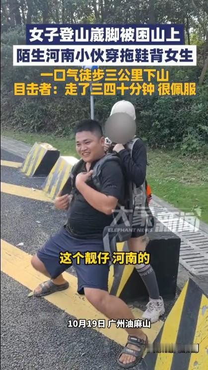 “佩服了,小伙子一口气背崴脚的女生3公里下山!”近日,广东广州,女子爬山的过程崴