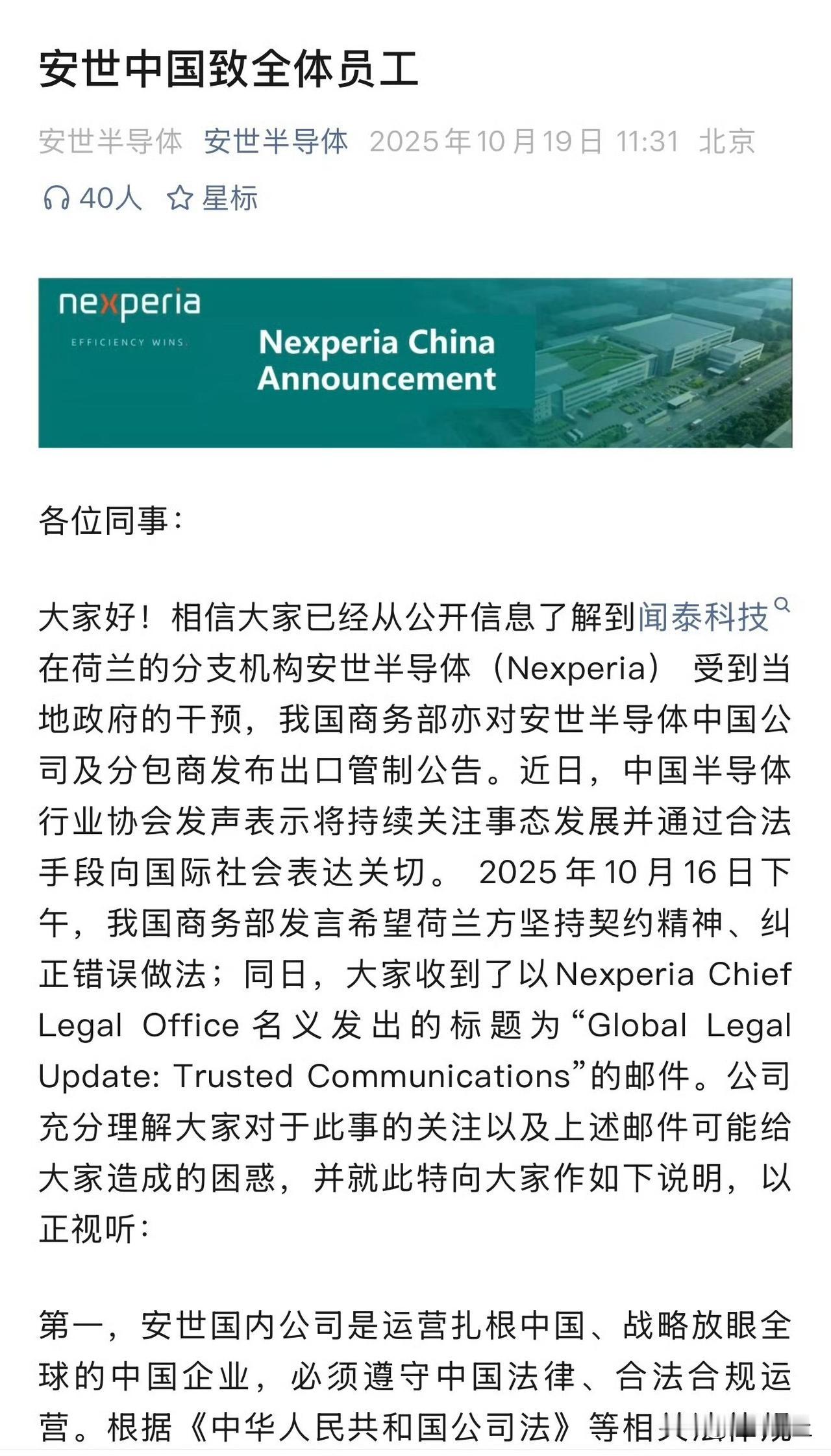 安世中国迅速与母公司切割,荷兰人这次真是丢人现眼。 安世中国这公司可不是普通企业,前身是荷兰恩智浦的半导体部门,2019年被中国闻泰科技花了330亿真金白银买下,成了中资全资控股的全球半导体巨头。 手里握着二极管、晶体管这些全球第一的生意,汽车、手机里少了它的芯片都得停工,说是“产业链水龙头”一点不夸张。 本来这是笔你情我愿的买卖,闻泰接手后把营收翻了倍,还给荷兰缴了上亿欧元的税,怎么看都是双赢的事儿。 可荷兰偏要跟着美国瞎折腾。9月底美国刚出了新规,把实体清单企业的子公司也划进管制,闻泰正好在清单里,安世自然躺枪。 结果美国新规发布才一天,荷兰政府就急吼吼地跳出来,拿冷战时期的老法律当幌子,说安世“有治理问题”,直接接管了它全球30个主体,禁止任何资产人员调整,还把闻泰创始人张学政的职务给暂停了。 嘴上说跟美国没关系,纯属巧合,这时间点凑得比剧本还准,明眼人都看得出来是怕被美国断了技术供应,赶紧跪地表忠心,那点骨气早就丢光了。更可笑的是操作起来还特别糙,一点都不讲究。 荷兰企业法庭上午收了外籍高管的申请,下午就出裁决,连让闻泰准备辩护的时间都不给,后来干脆把中资持有的99%股权全强制托管了,美其名曰“保障欧洲供应链”,实则就是强取豪夺。 这些外籍高管其实早有私心,想把公司拆出去独立上市自己拿奖金,荷兰政府正好借坡下驴,硬是把企业治理变成了地缘政治的工具,吃相也太难看了。 荷兰大概是得意忘形忘了自己的软肋。安世70%的芯片都要拿到中国东莞封测,它自己的汽车业、新能源产业全靠从中国进口锰、镁这些关键原材料,根本没法替代。 这边刚接管安世,中国商务部立马反制,禁止安世中国出口特定元器件,欧洲车企立马就慌了神,毕竟2021年缺芯片的教训还在眼前,少一颗几毛钱的芯片就得停产,一天损失上千万。 这下荷兰彻底傻眼了,赶紧跑去求豁免,之前的嚣张气焰全没了,这不就是搬起石头砸自己的脚? 安世中国也是被逼得没办法才切割的。荷兰总部不光封了中国员工的系统账号,还敢停发工资,摆明了要撕破脸。 10月18号安世中国干脆发公告划红线,说国内员工只听中国公司的指令,薪资福利自己扛,等于直接跟荷兰那边一刀两断。这哪是主动切割,分明是被荷兰的无理操作逼出来的自保,换谁都得这么干。 说实话,荷兰这波操作丢的可不只是面子。本来全球企业都信市场经济那套,现在看荷兰说抢就抢中资资产,以后谁还敢去荷兰投资? 而且它把全球化分工的规矩全砸了,逼着企业搞各自为战,最后这些成本还得转嫁到消费者身上,汽车、手机都得涨价。 跟着美国当马前卒,结果坑了自己的企业,害了全球供应链,这种赔本赚吆喝的事儿,也就荷兰干得出来,说一句丢人现眼真不算冤枉它。