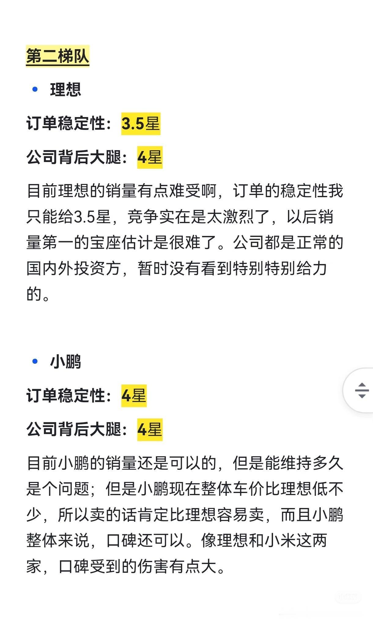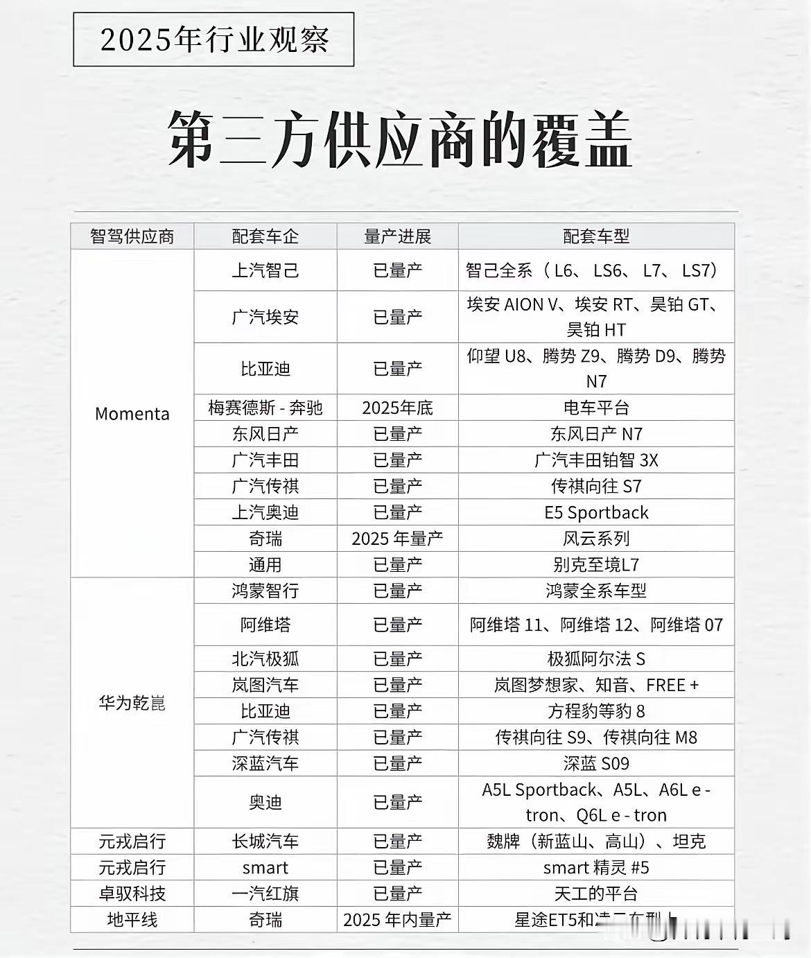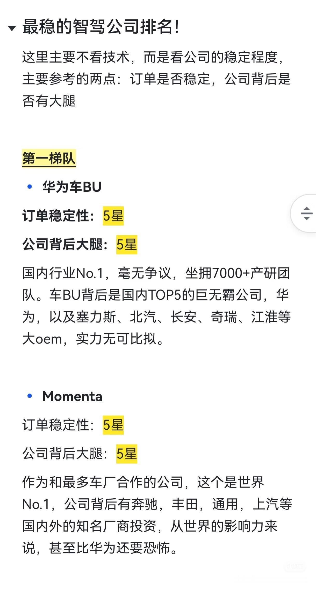 国内最大的智能驾驶公司目前来讲我觉得还是momenta,为什么不是华为 第一个原因就是华为的合作车型都是价位偏高的车型,除了尚界以外其他车型的价格都在20万元以上 其次就是灵魂,很多厂商觉得用上华为的智能驾驶都会丢掉自身的灵魂,虽然不是很理解哈,我觉得华为可以理解为一个一级供应商,不过很多汽车品牌不这么认可
