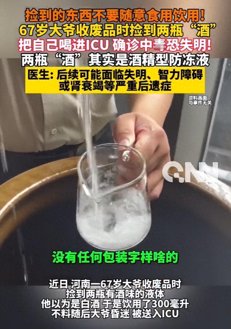 ”河南郑州,一老人收破烂时,捡了2瓶没有包装的液体,打开后还能闻到酒味,老人以为是白酒,就喝了半斤多,结果人很快晕了过去!送往医院后,医生发现那是酒精型的防冻液,由于国内没有特效药,只能通过注射白酒解毒。 10月的郑州,67岁的王大爷像往常一样在小区翻找废品。垃圾桶边两个透明瓶子引起他的注意:没标签、没包装,打开一闻却有股酒香。 这位平时连散装白酒都舍不得买的老人,如获至宝地把瓶子塞进编织袋,盘算着中午解馋。几小时后,他在树荫下倒出半斤多“白酒”一饮而尽。 可酒劲还没上来,先来了头晕眼花,天旋地转中直接栽倒在地。邻居发现时,老人已昏迷不醒,急救车呼啸着把他送进医院。 急诊室里,医生盯着化验单倒吸凉气:血液中乙二醇和甲醇浓度爆表!“这是防冻液中毒,20毫升就能要命,他喝了300毫升!” 主治医生立刻判断必须用白酒解毒:原来防冻液和真酒在人体内会争夺同一种代谢酶,灌服高度白酒能“骗”过酶先去分解乙醇,从而阻止毒物转化,为洗胃争取时间。 监护仪滴滴作响,王大爷的肾脏指标已亮红灯。护士通过鼻饲管将50度白酒缓缓注入胃中,每天一斤的量连续输注。家属看得目瞪口呆:平时劝他戒酒,此刻却要靠酒精续命。 这种看似荒诞的疗法,实则是无奈之举。防冻液主要成分乙二醇本身毒性不强,但进入人体后会变成草酸结晶,像玻璃渣一样堵塞肾小管。 更棘手的是,全球公认的特效解毒剂“甲吡唑”在国内尚未上市。医生们只能退而求其次,用白酒中的乙醇竞争代谢通道。 这套方案要求精密控制血酒精浓度,稍有不慎就会加重肝脏负担。王大爷的遭遇并非个例。 去年河南驻马店一位六旬老汉,误喝分装在饮料瓶里的防冻液后,送医时血液已凝固成胶冻状,最终因肝肾衰竭去世。 防冻液误食事件频发,与其物理特性直接相关。乙二醇无色无臭带甜味,常温下黏稠度类似糖水,极易被误认作饮料。 更讽刺的是,为防发动机冻结,厂商常添加酒精成分,这让防冻液闻起来更像白酒。汽车维修工、环卫工人、拾荒老人成高危群体。 他们常接触废弃容器,又缺乏化学品辨识知识。就像网友吐槽:“把毒液装进矿泉水瓶,相当于给手枪套上糖果包装。” 事故背后暴露的问题更值得深思。多数家庭习惯用饮料瓶分装防冻液、农药等液体,贴上标签的不足三成。汽车保养店常将废防冻液直接倒入普通垃圾桶。 更关键是公众认知盲区。很多人不知道,防冻液中毒有潜伏期:初期像醉酒,几小时后才开始肾痛、视力模糊,等出现症状时已错过最佳抢救期。 改变需要多方发力。社区可设置危险废物回收点,用积分兑换鼓励居民规范丢弃。生产企业不妨学习国外经验,在防冻液中加入苦味剂,让人一闻就避而远之。 这场事故映照出底层生存者的艰辛,更敲响公共安全的警钟:当一瓶白酒既能载舟亦能覆舟时,比“以酒攻毒”更重要的,是筑牢那道阻止危险品流向垃圾桶的防线。 参考资料: 《67岁大爷以为捡到白酒喝300毫升进ICU,实为防冻液,医生:20毫升可致命,或面临肾衰竭等后遗症》——红星新闻