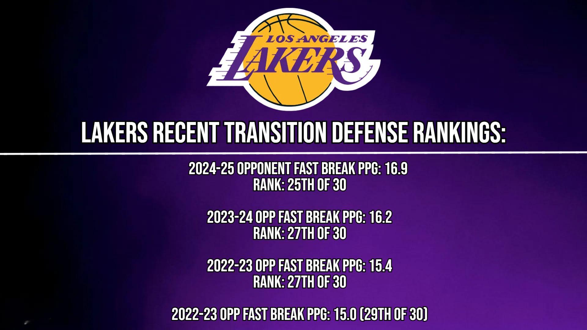 最近4个赛季,湖人的退防一直是个问题,场均被对方快攻得分的排名始终在末尾徘徊。2021-22赛季,第29位。2022-23赛季,第27位。2023-24赛季,第27位。2024-25赛季,稍有进步,第25位。[思考][思考][思考]